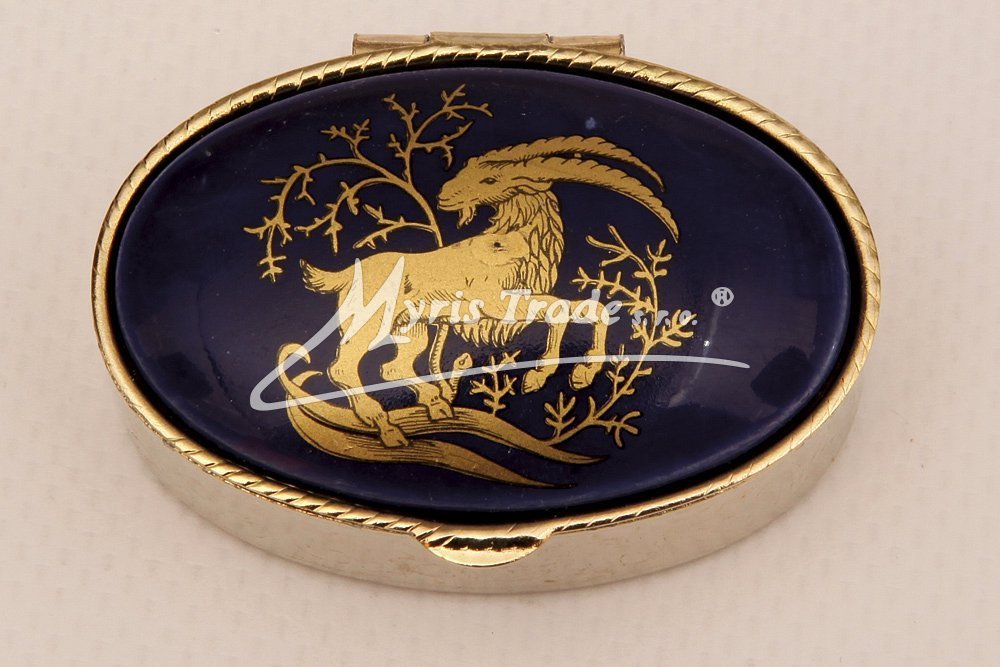 klasická oválná lékovka je vyrobena z kovu zlaté barvy s porcelánovým víčkem s motivem ze zvěrokruhu