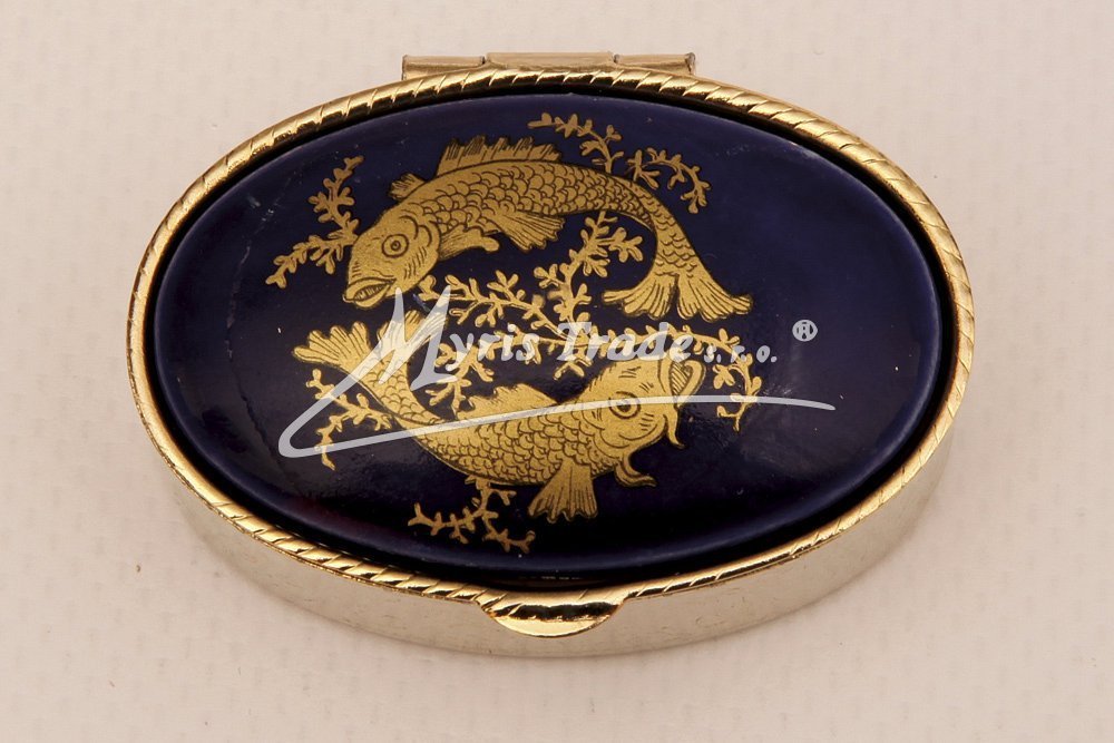 klasická oválná lékovka je vyrobena z kovu zlaté barvy s porcelánovým víčkem s motivem ze zvěrokruhu