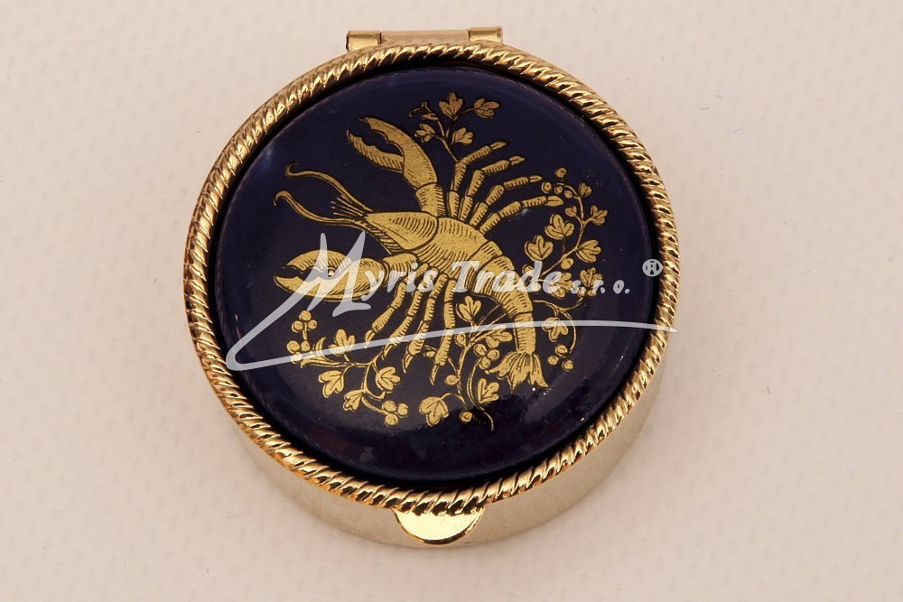 klasická kulatá lékovka je vyrobena z kovu zlaté barvy s porcelánovým víčkem s motivem ze zvěrokruhu