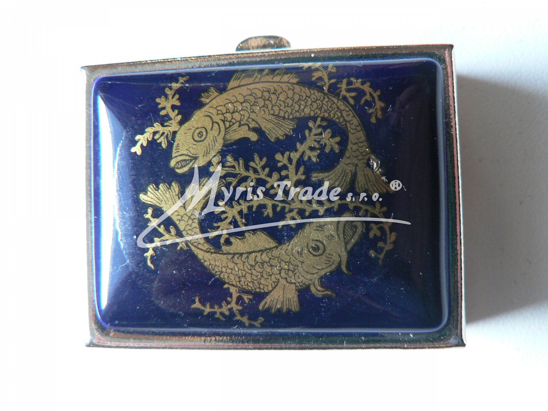 klasická obdélníková lékovka je vyrobena z kovu zlaté barvy s porcelánovým víčkem s motivem ze zvěrokruhu
