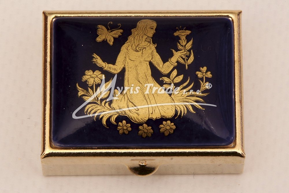 klasická obdélníková lékovka je vyrobena z kovu zlaté barvy s porcelánovým víčkem s motivem ze zvěrokruhu