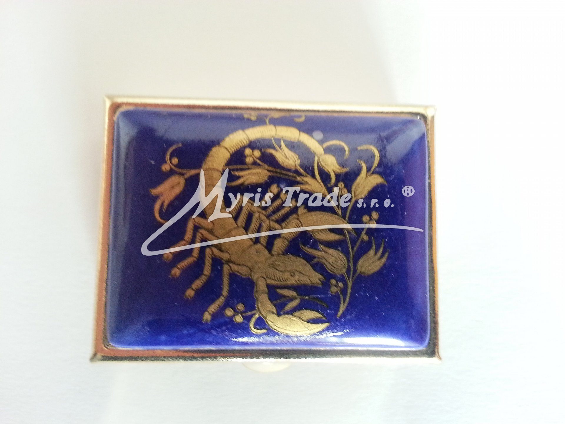 klasická obdélníková lékovka je vyrobena z kovu zlaté barvy s porcelánovým víčkem s motivem ze zvěrokruhu