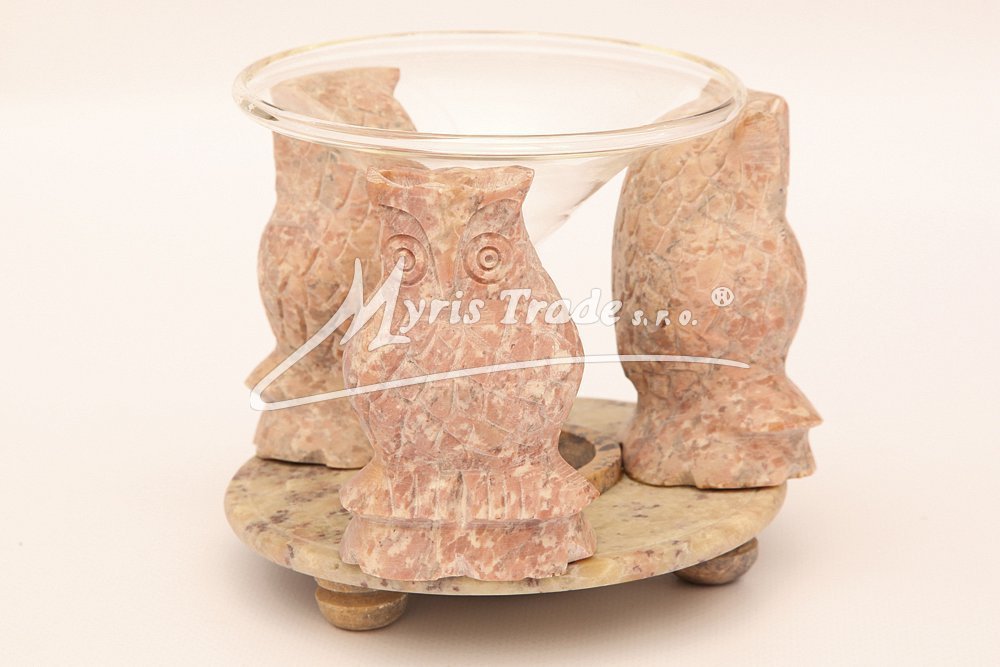 ručně vyřezávaná přírodní aromalampa na čajovou svíčku a aromaolej se soškami tří sov v přírodní barvě