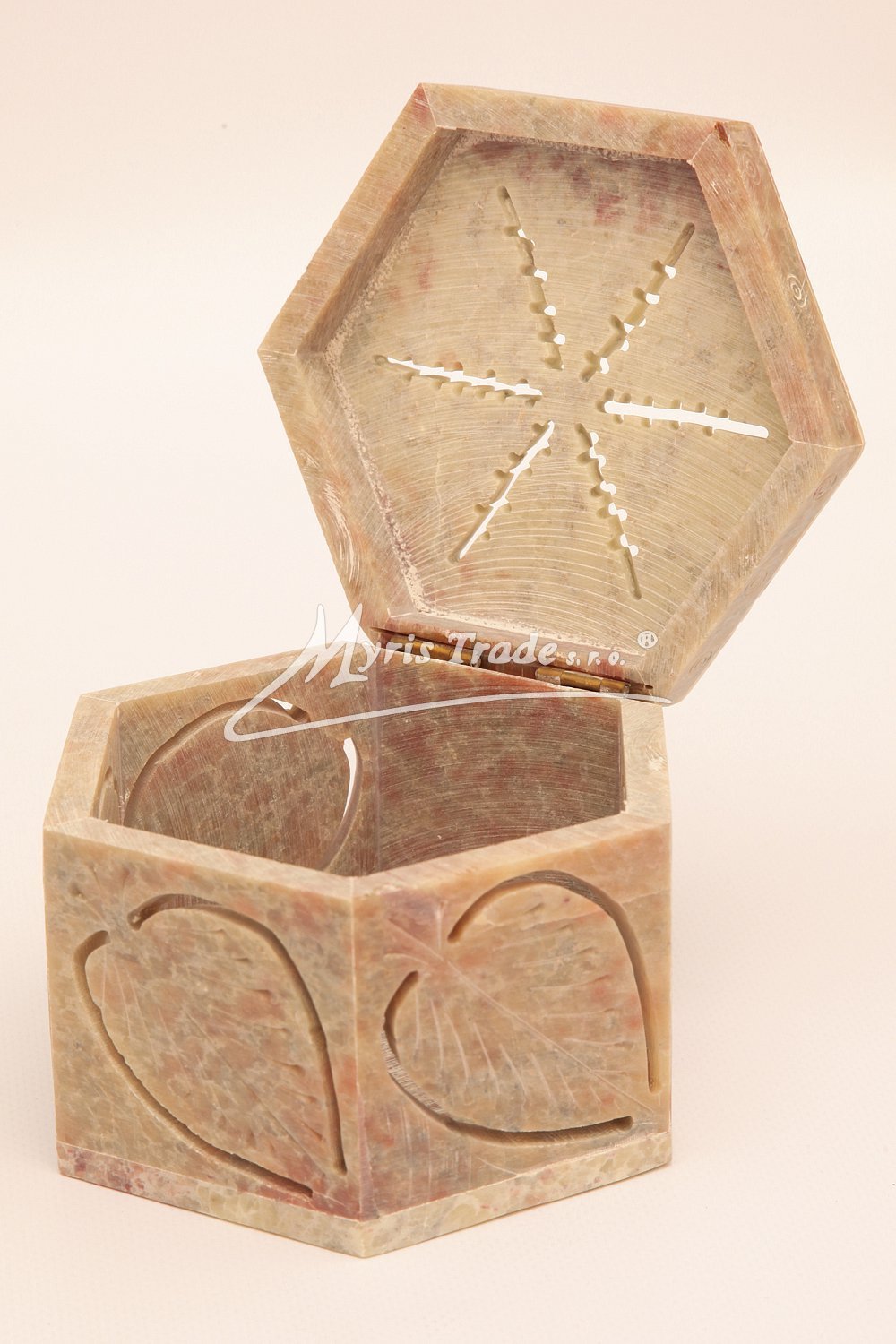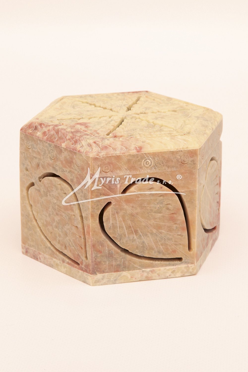 Šperkovnice z mastku s bohatě vyřezávaným víkem. Barva na obrázku je orientační. Každý kus je originální, a má svoji vlastní barvu a žíhání kamene. Žádný kus není stejný.