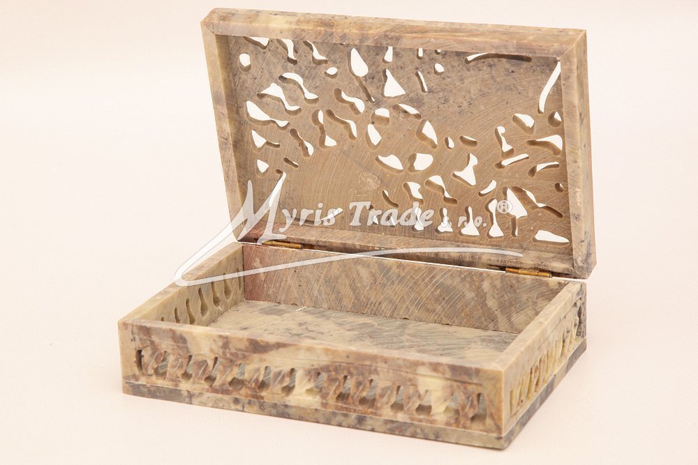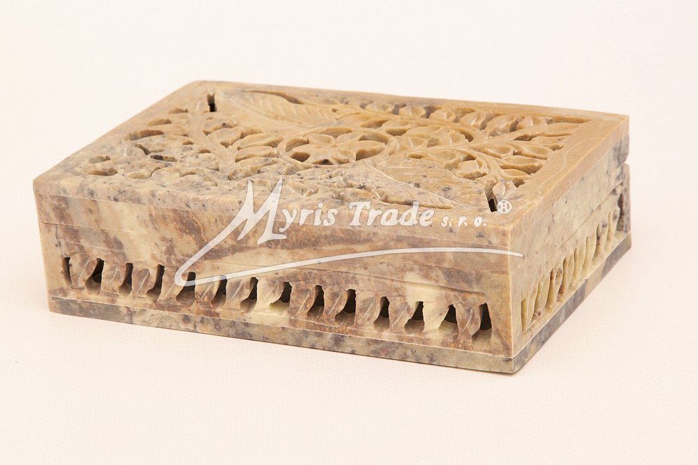Šperkovnice z mastku s bohatě vyřezávaným víkem. Barva na obrázku je orientační. Každý kus je originální, a má svoji vlastní barvu a žíhání kamene. Žádný kus není stejný.