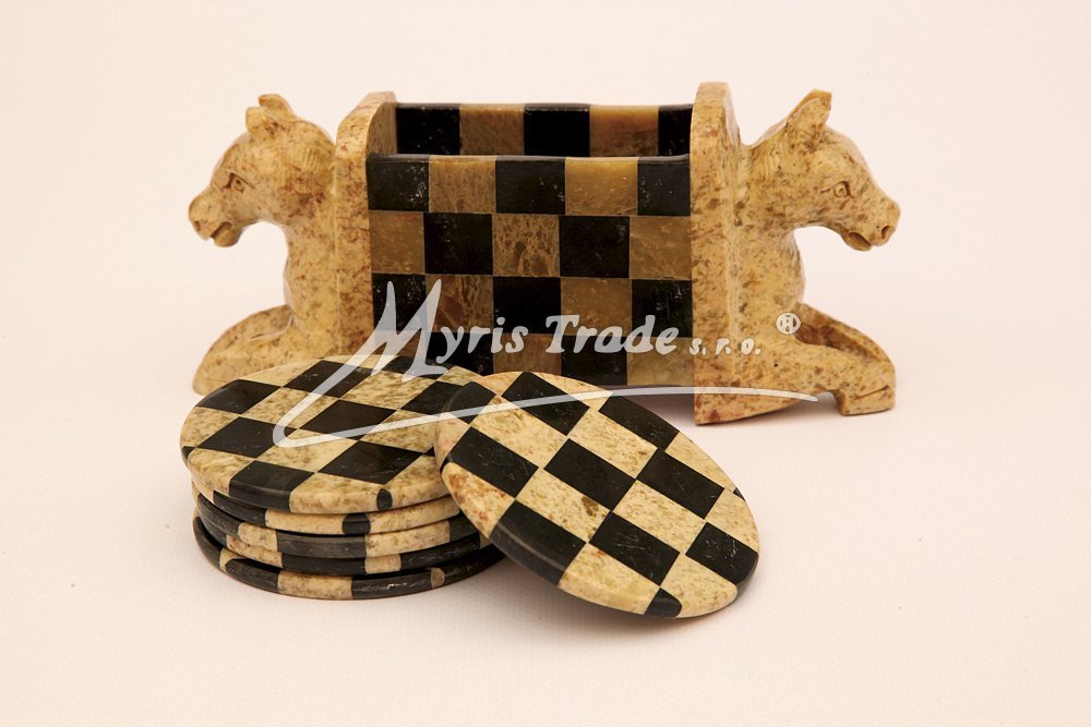 ozdobný držák v podobě koně s 6ti podtácky pod skleničky je vyroben z kamene (mastku)v kombinaci přírodní a černé barvy a je leštěný.