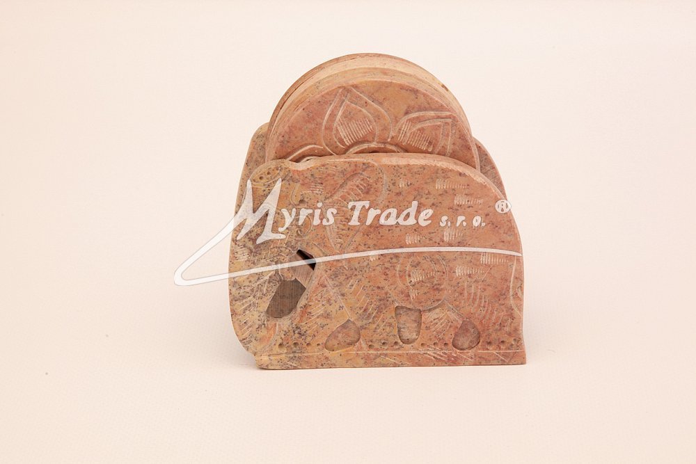 ozdobný, vyřezávaný držák v podobě slona s 6ti podtácky pod skleničky je vyroben z kamene (mastku). Barva na obrázku je pouze orientační. Každý kus je originální, a má svoji vlastní barvu a žíhání kamene. Žádný kus proto není stejný.