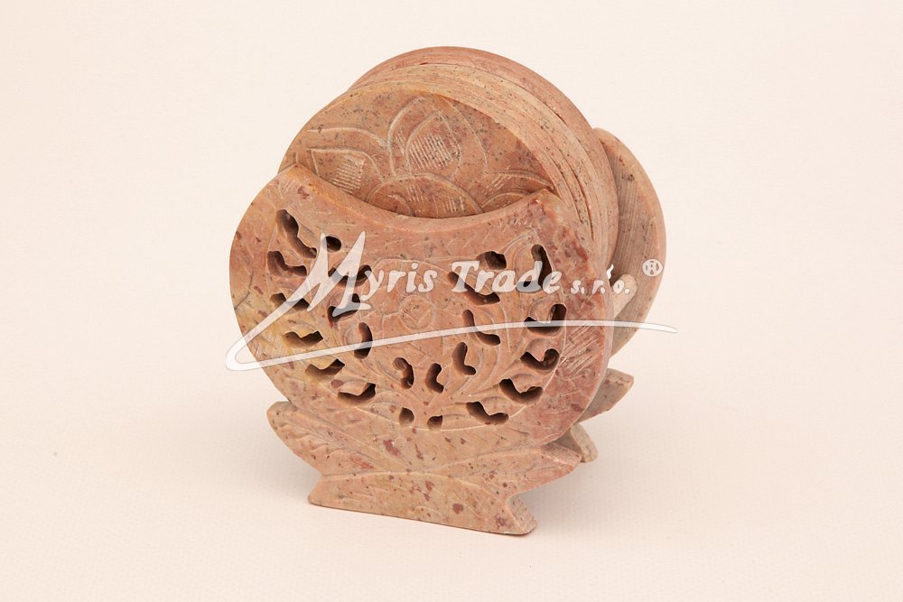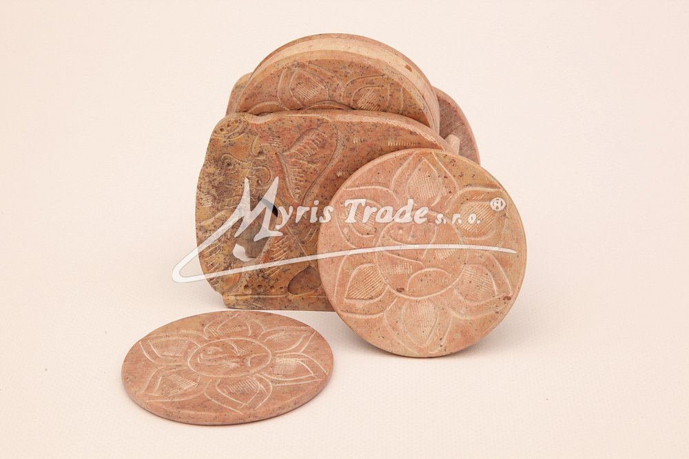 ozdobný, vyřezávaný držák v podobě květiny s 6ti podtácky pod skleničky je vyroben z kamene (mastku). Barva na obrázku je pouze orientační. Každý kus je originální, a má svoji vlastní barvu a žíhání kamene. Žádný kus proto není stejný.