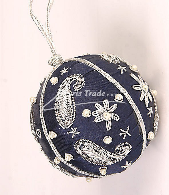 Textilní vánoční koule s perličkami. Vánoční koule je ručně pošívaná perličkami a kovovým drátkem ve stříbrné barvě.