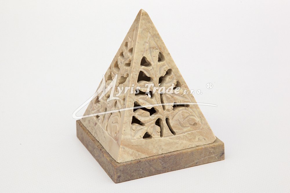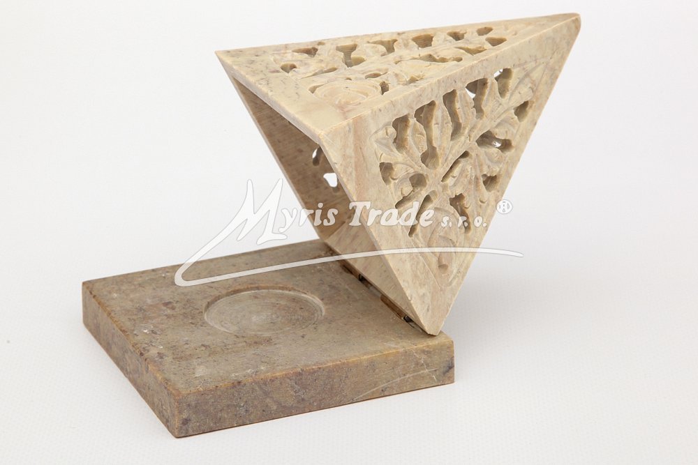 bohatě vyřezávaný svícen na stojánku v podobě pyramidy, na čajovou svíčku nebo vonné františky, je ručně vyroben z přírodního mastku
