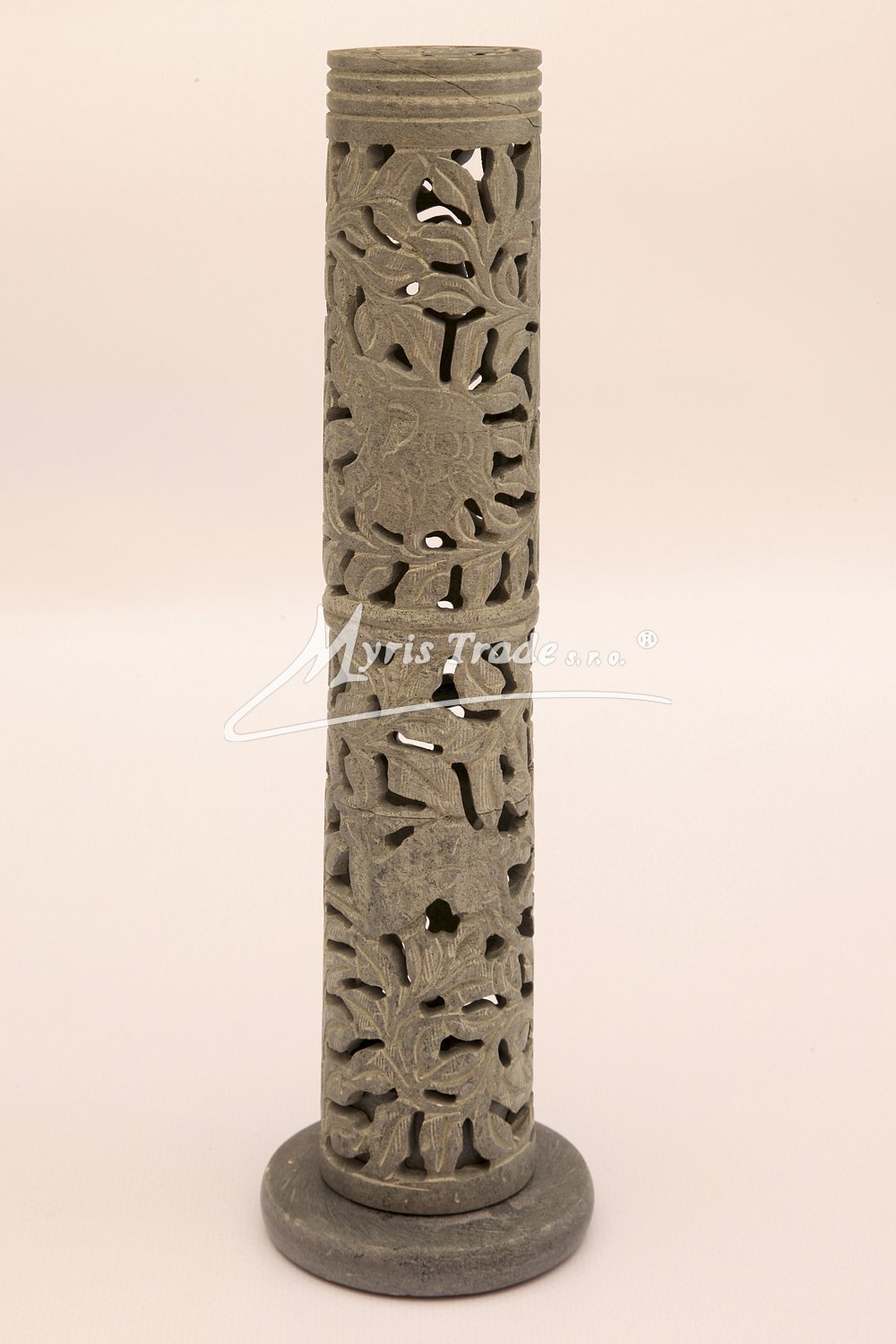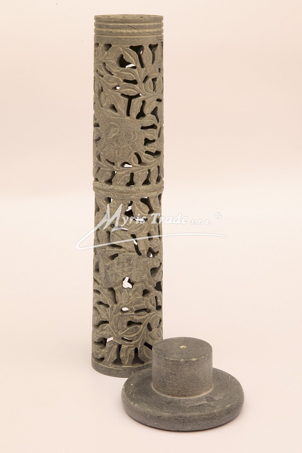 vyřezávaný stojan na vonnou tyčinku v šedé barvě je ručně vyroben z mastku, jednoho z nejměkčích kamenů.