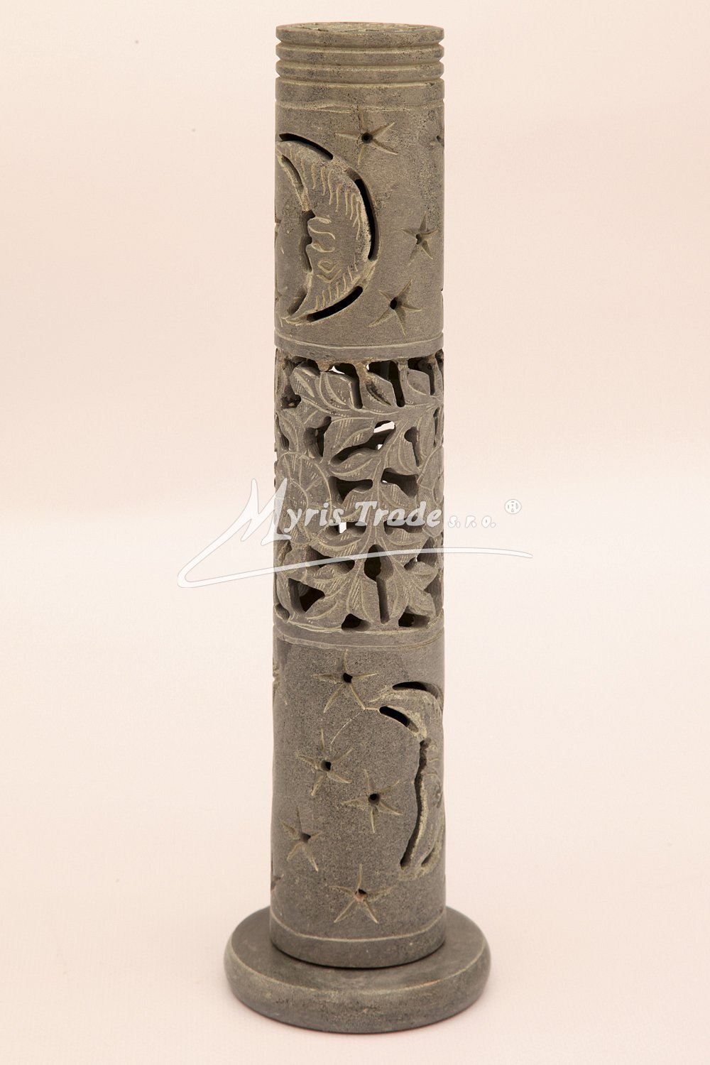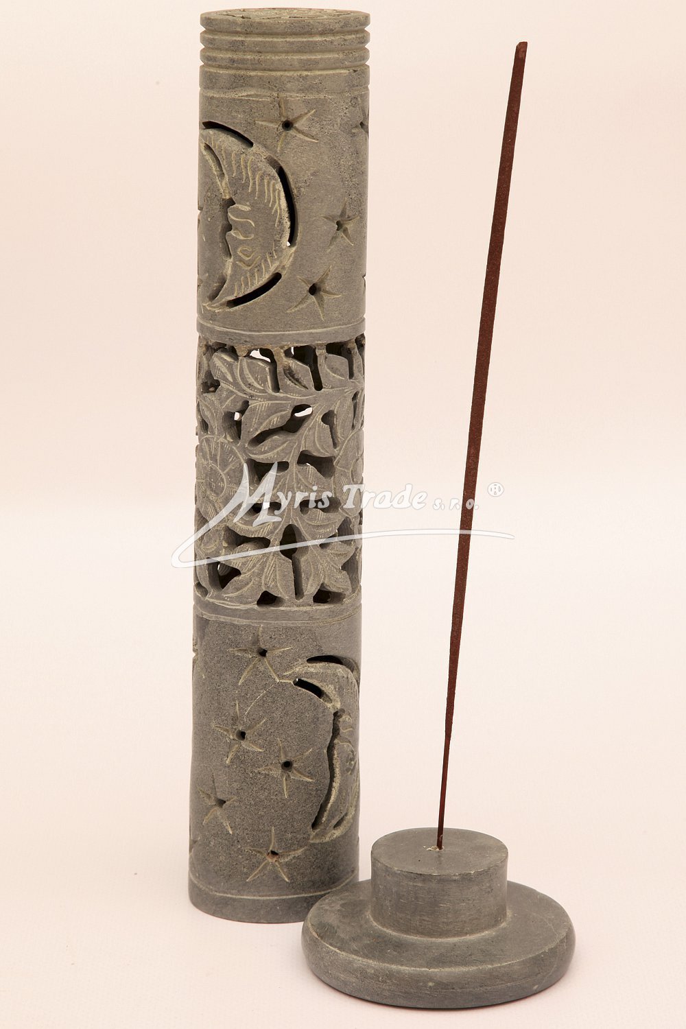 vyřezávaný stojan na vonnou tyčinku v šedé barvě je ručně vyroben z mastku, jednoho z nejměkčích kamenů.