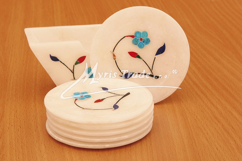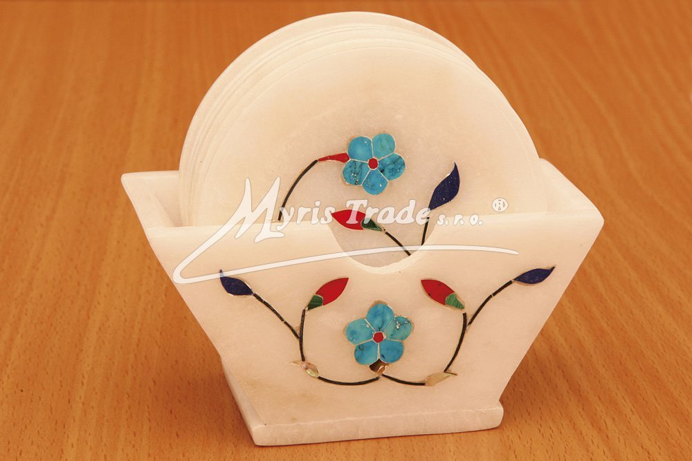 Mramorový držák vykládaný polodrahokami s šesti mramorovými a polodrahokami zdobenými podtácky pod skleničky