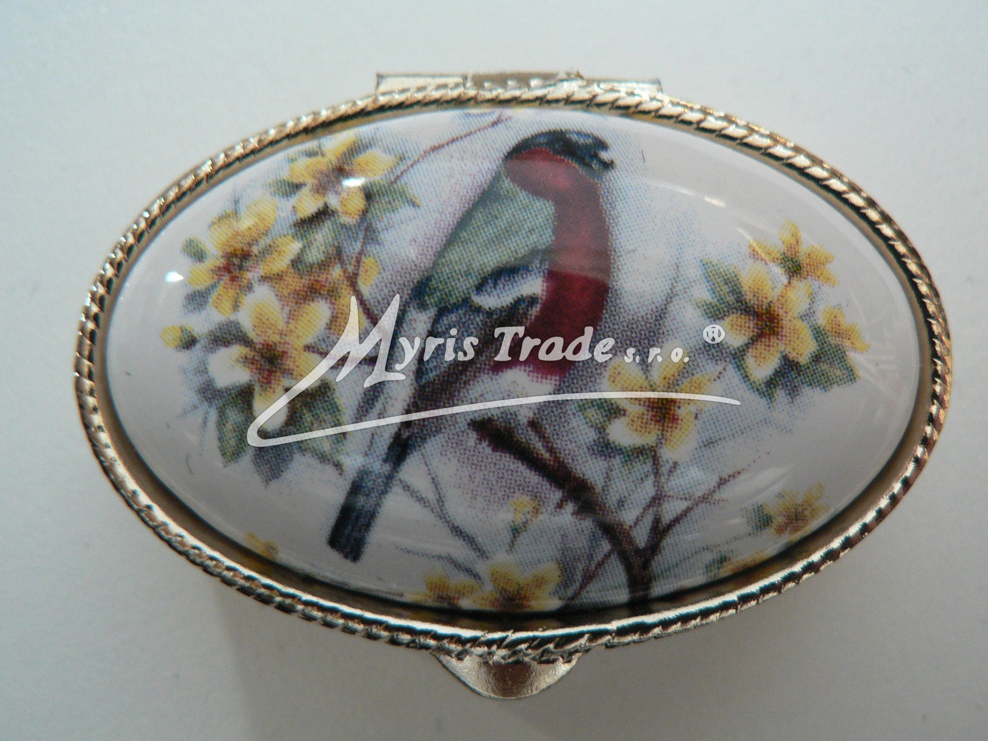 klasická oválná lékovka je vyrobena z kovu zlaté barvy s porcelánovým víčkem s motivem ptáčků
