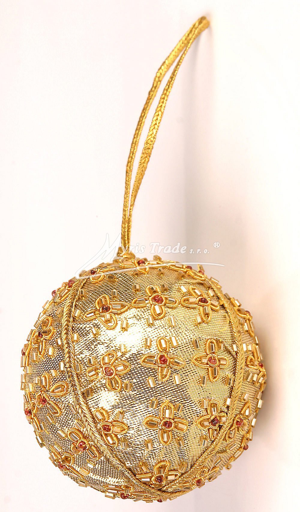Textilní vánoční koule s korálky. Vánoční koule je ručně pošívaná korálky a kovovým drátkem ve zlaté barvě.