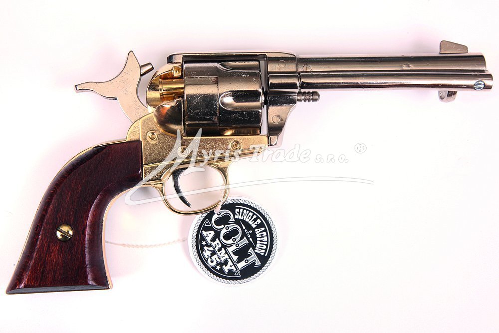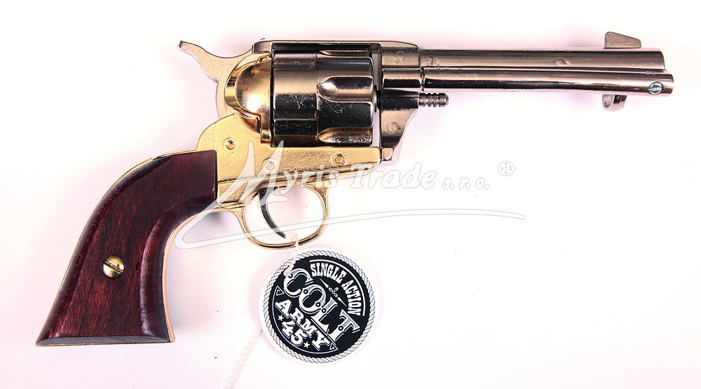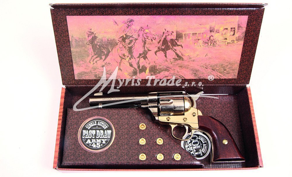 nefunkční replika revolveru ráže 45 s dřevěnou pažbou hlaveň a bubínek jsou poniklované a doplněné mosazným zdobením Balená ve stylové krabici s replikami nábojů