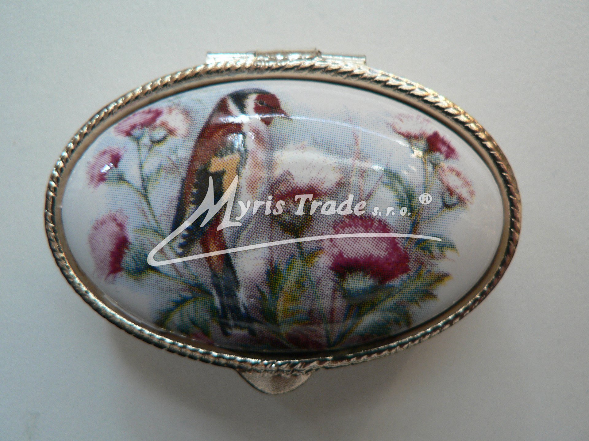 klasická oválná lékovka je vyrobena z kovu zlaté barvy s porcelánovým víčkem s motivem ptáčků