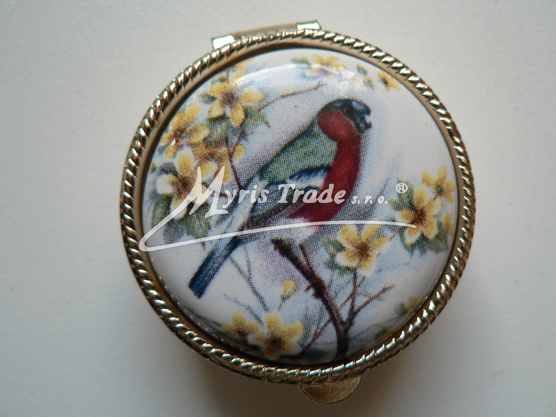 klasická kulatá lékovka je vyrobena z kovu zlaté barvy s porcelánovým víčkem s motivem ptáčků