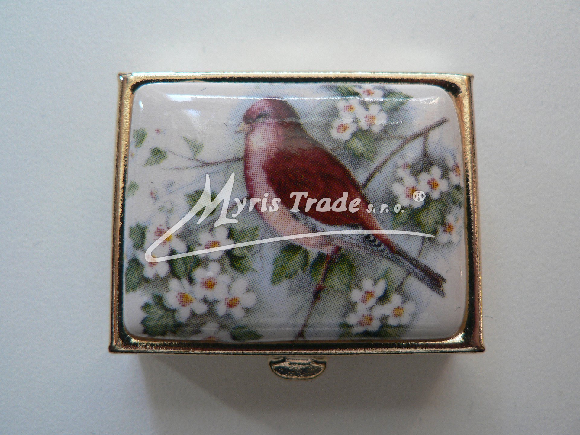 klasická obdélníková lékovka je vyrobena z kovu zlaté barvy s porcelánovým víčkem s motivem ptáčků