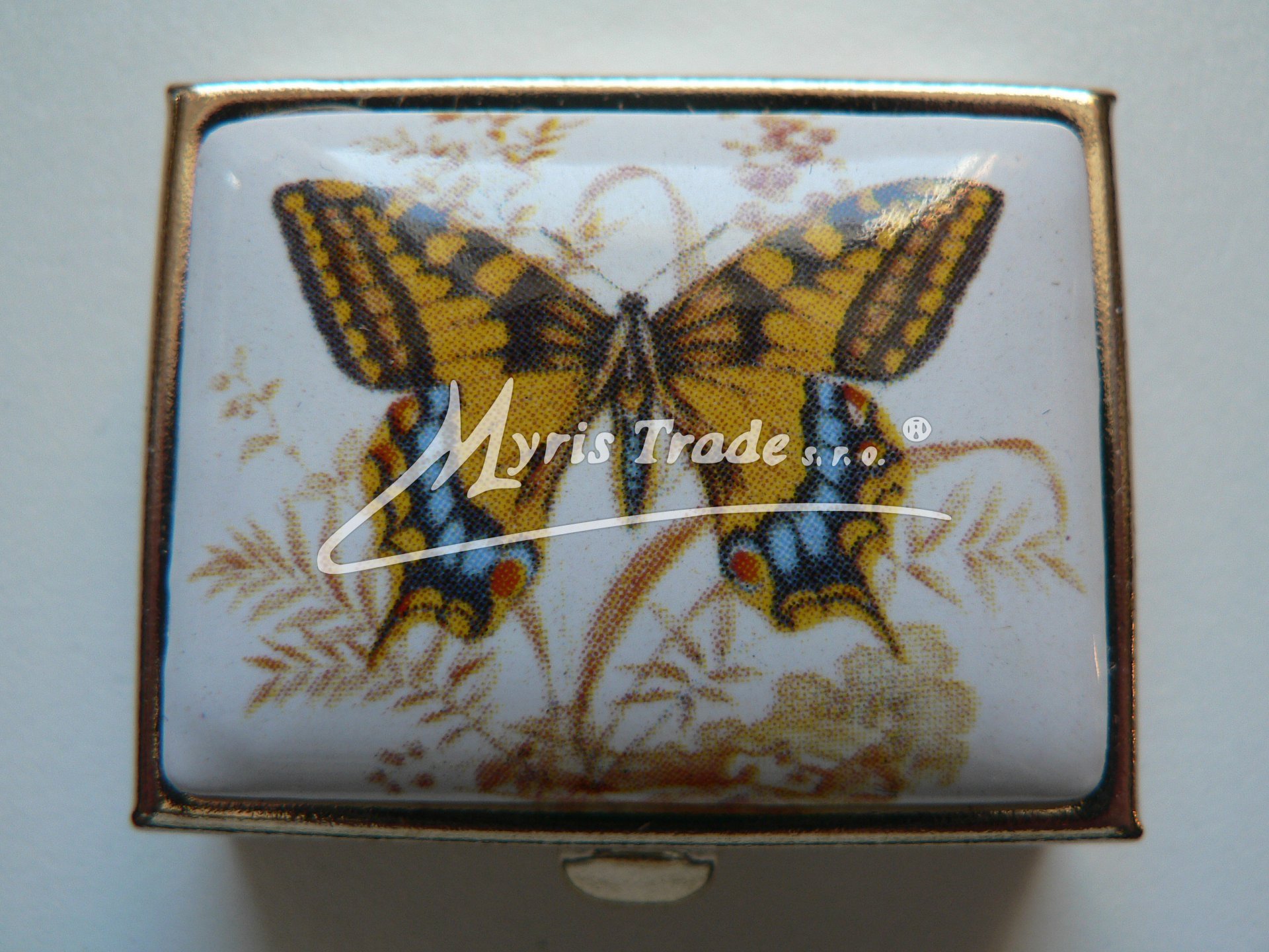 klasická obdélníková lékovka je vyrobena z kovu zlaté barvy s porcelánovým víčkem s motivem motýla