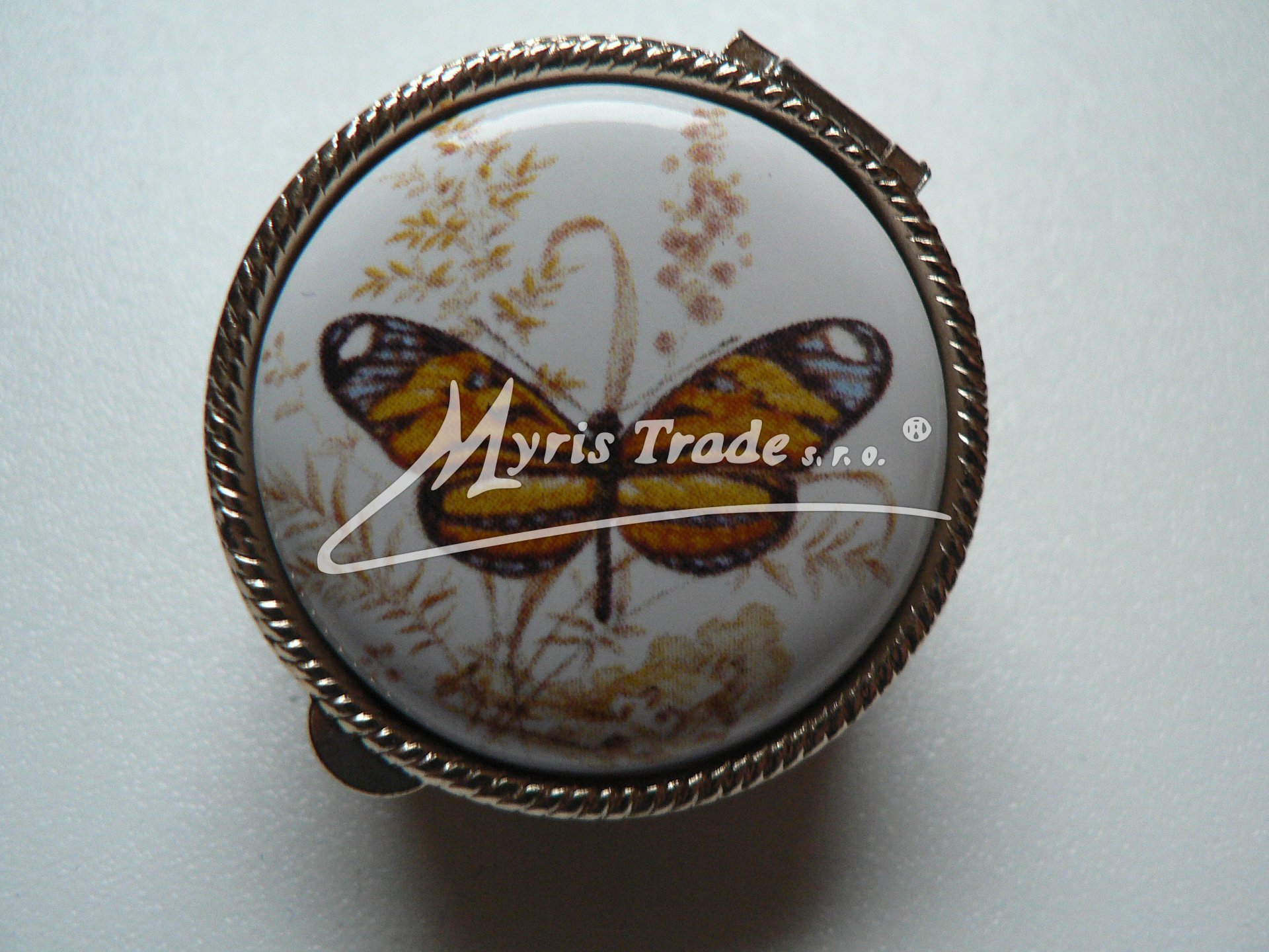 klasická kulatá lékovka je vyrobena z kovu zlaté barvy s porcelánovým víčkem s motivem motýla