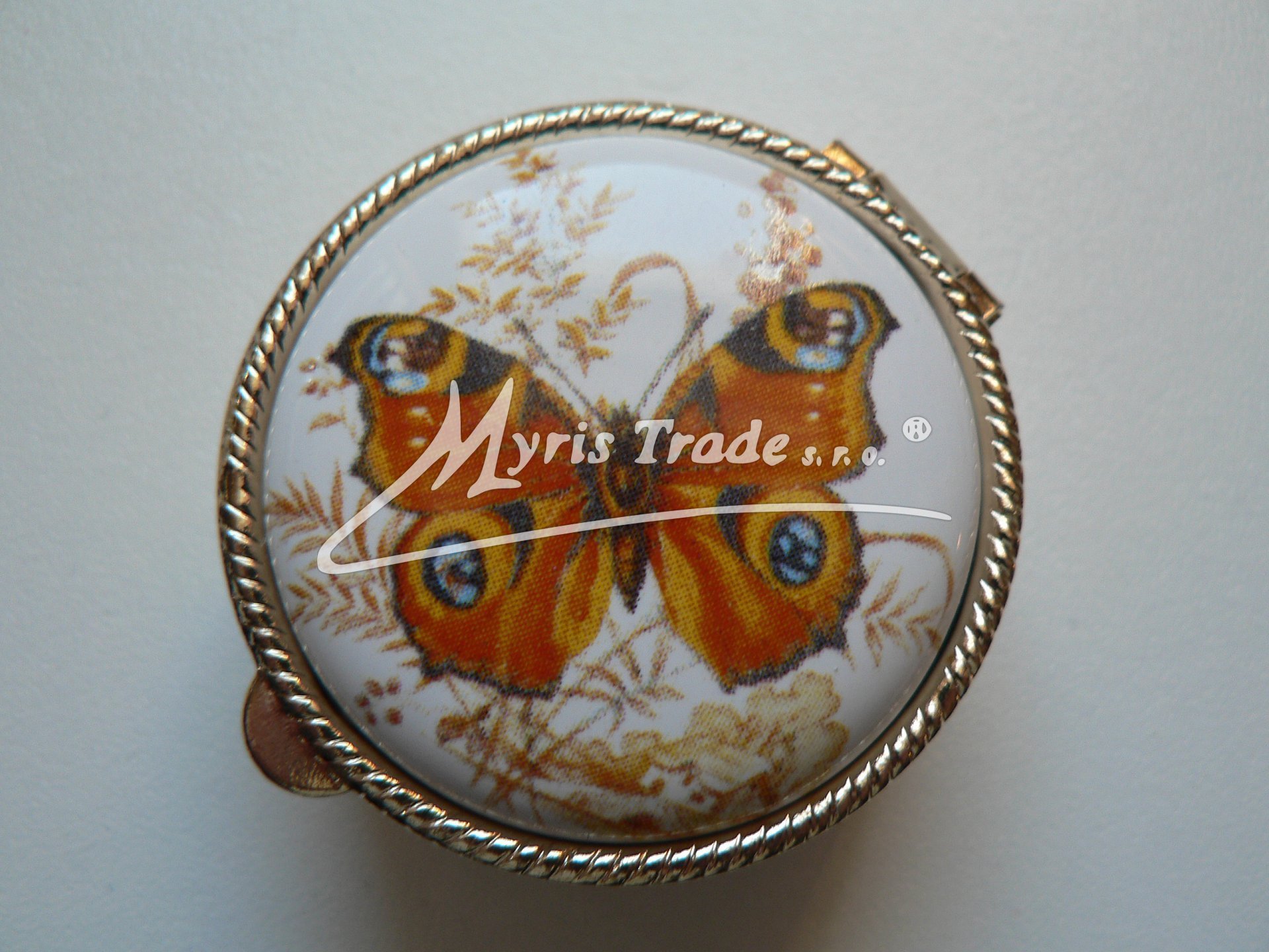 klasická kulatá lékovka je vyrobena z kovu zlaté barvy s porcelánovým víčkem s motivem motýla