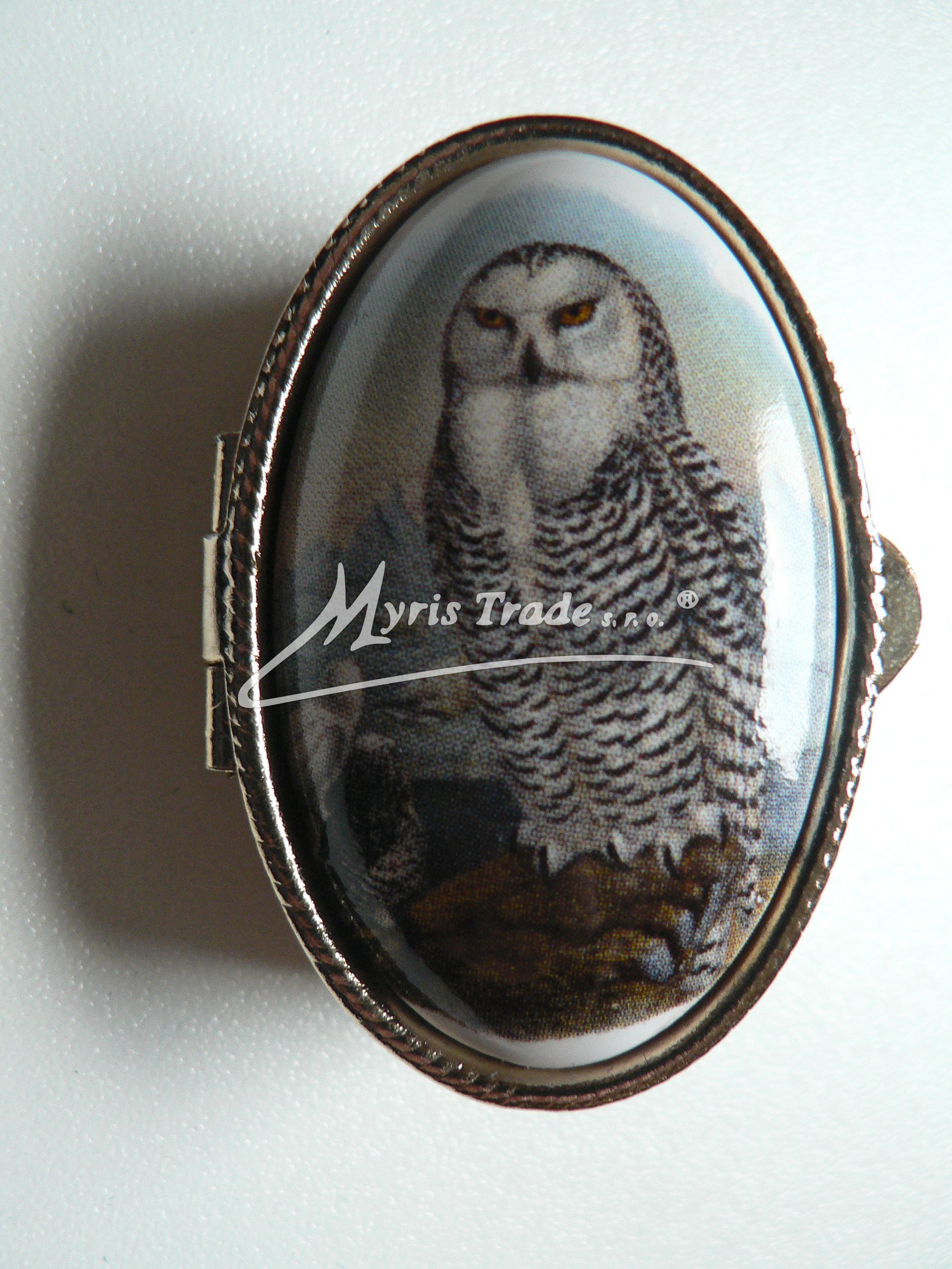 klasická oválná lékovka je vyrobena z kovu zlaté barvy s porcelánovým víčkem s motivem sovy