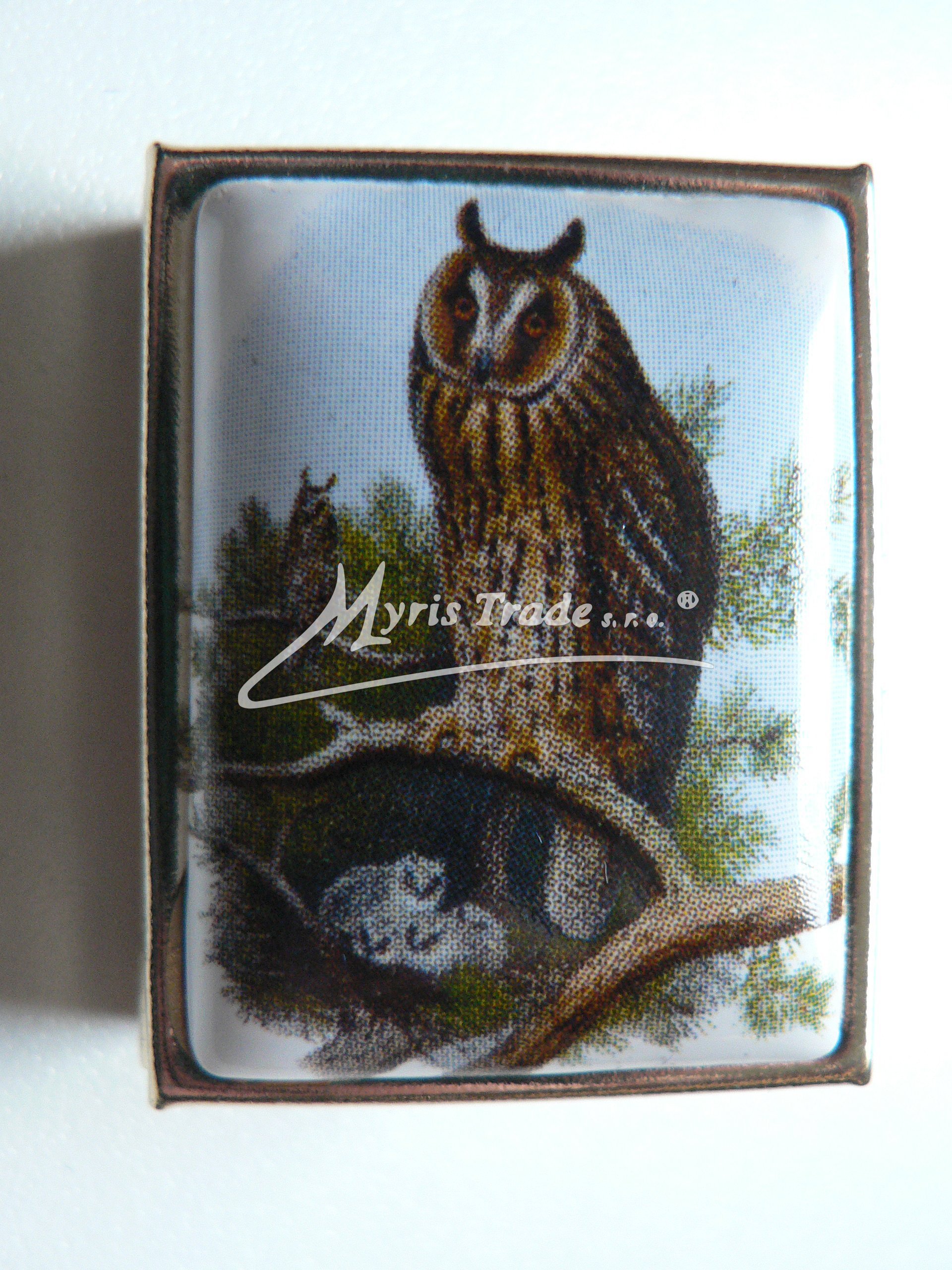 klasická obdélníková lékovka je vyrobena z kovu zlaté barvy s porcelánovým víčkem s motivem sovy