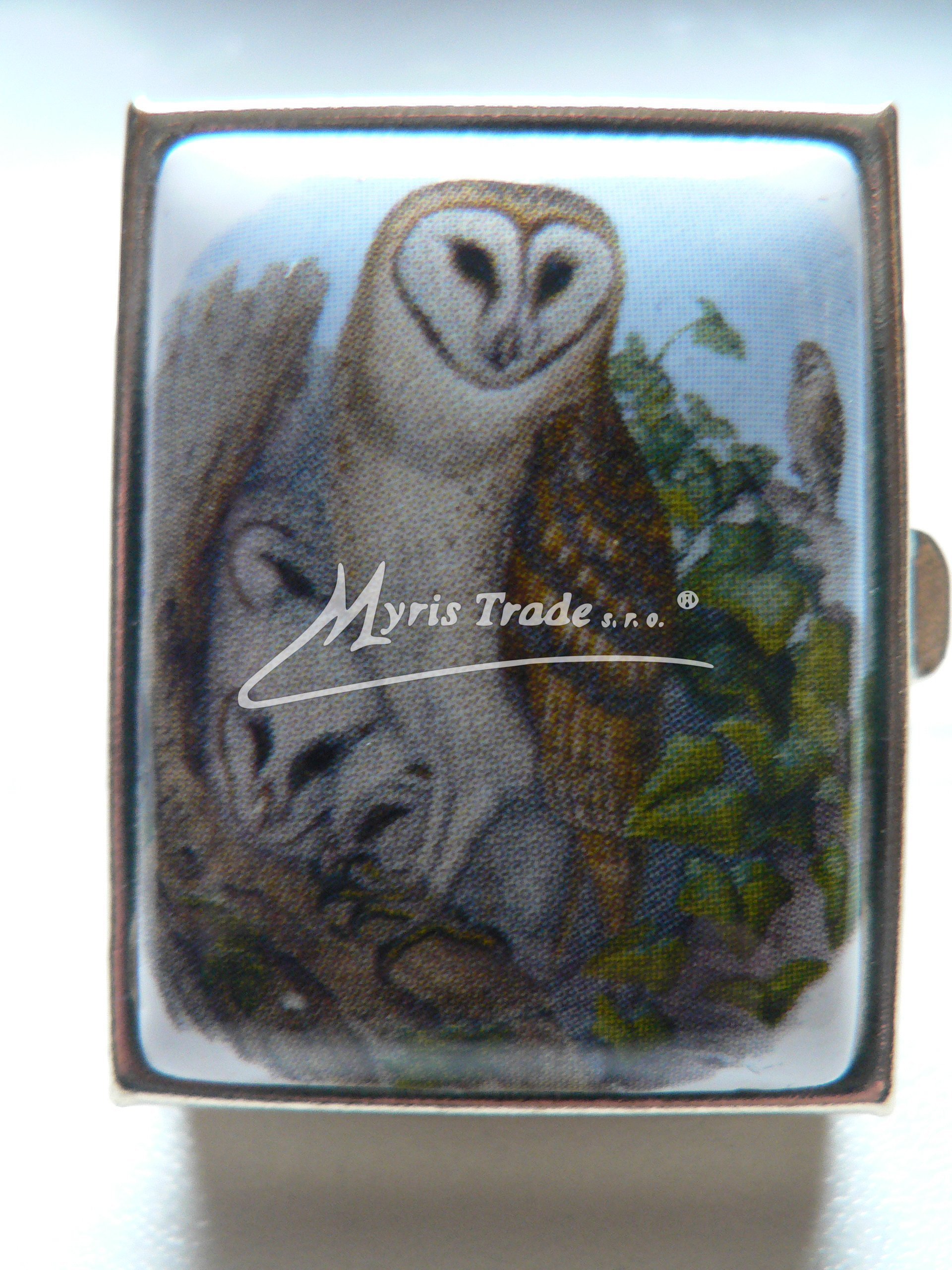 klasická obdélníková lékovka je vyrobena z kovu zlaté barvy s porcelánovým víčkem s motivem sovy