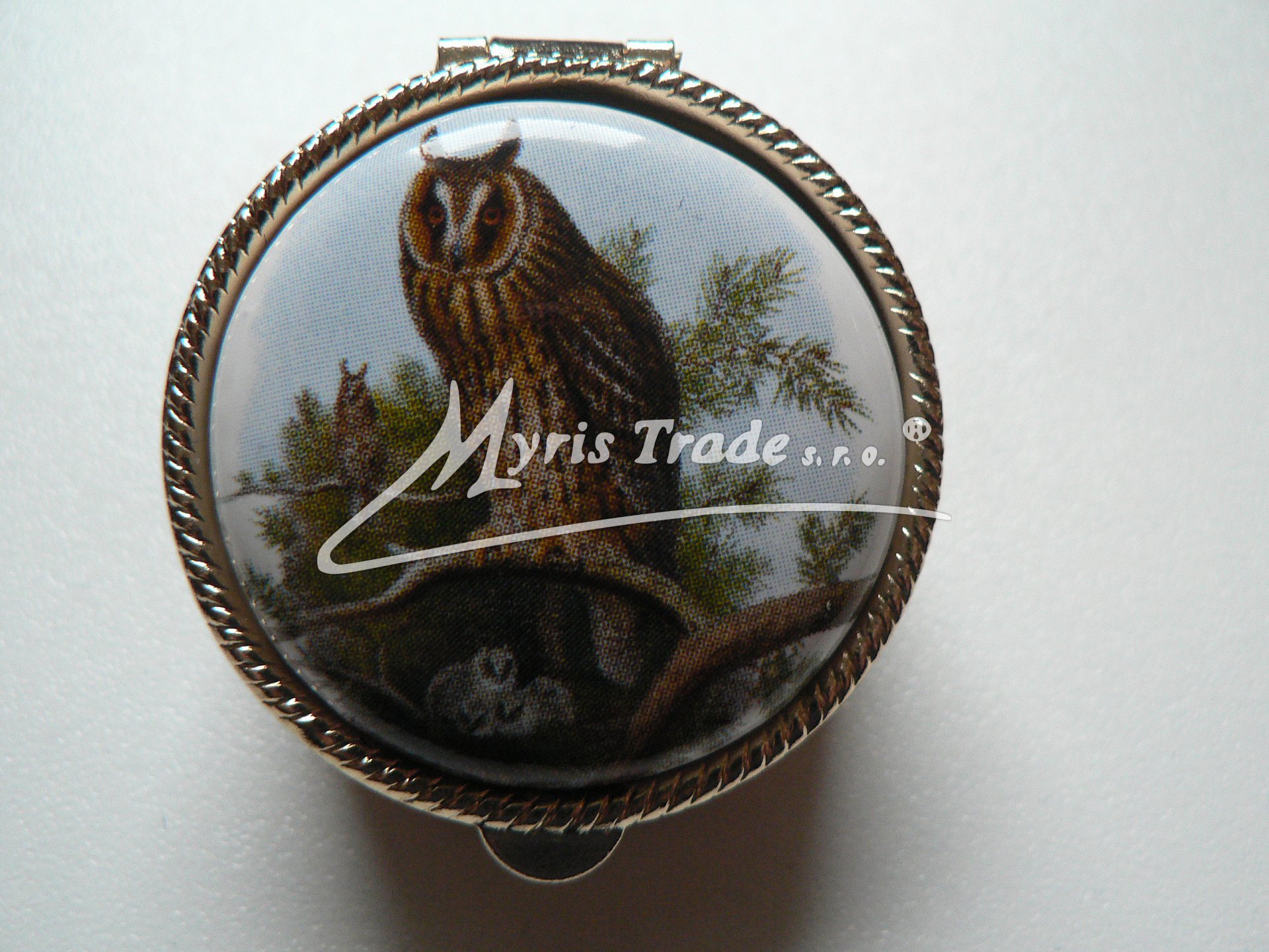 klasická kulatá lékovka je vyrobena z kovu zlaté barvy s porcelánovým víčkem s motivem sovy
