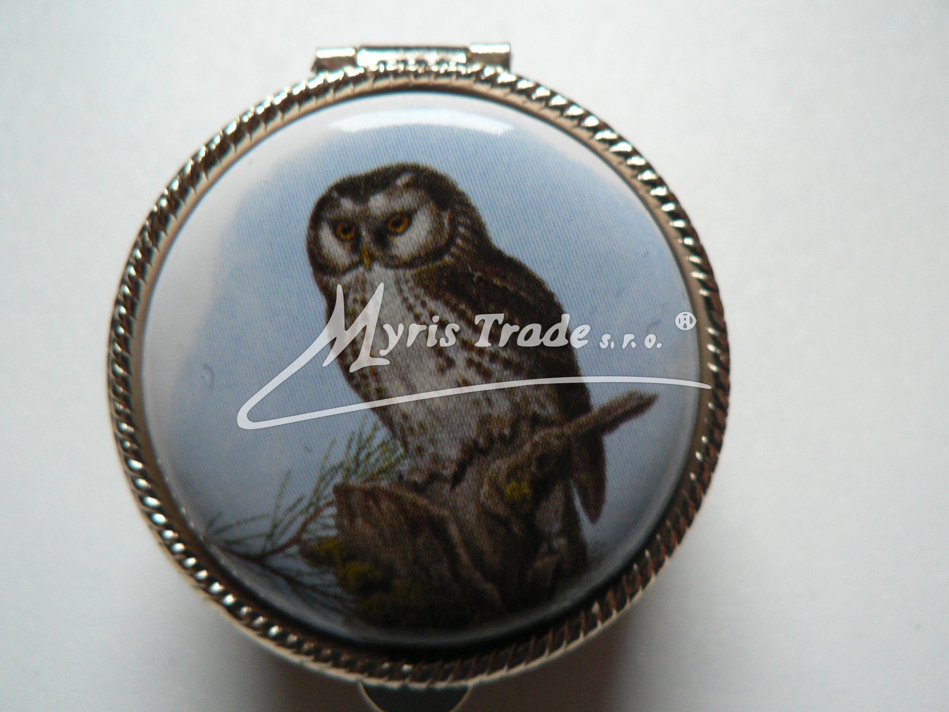 klasická kulatá lékovka je vyrobena z kovu zlaté barvy s porcelánovým víčkem s motivem sovy