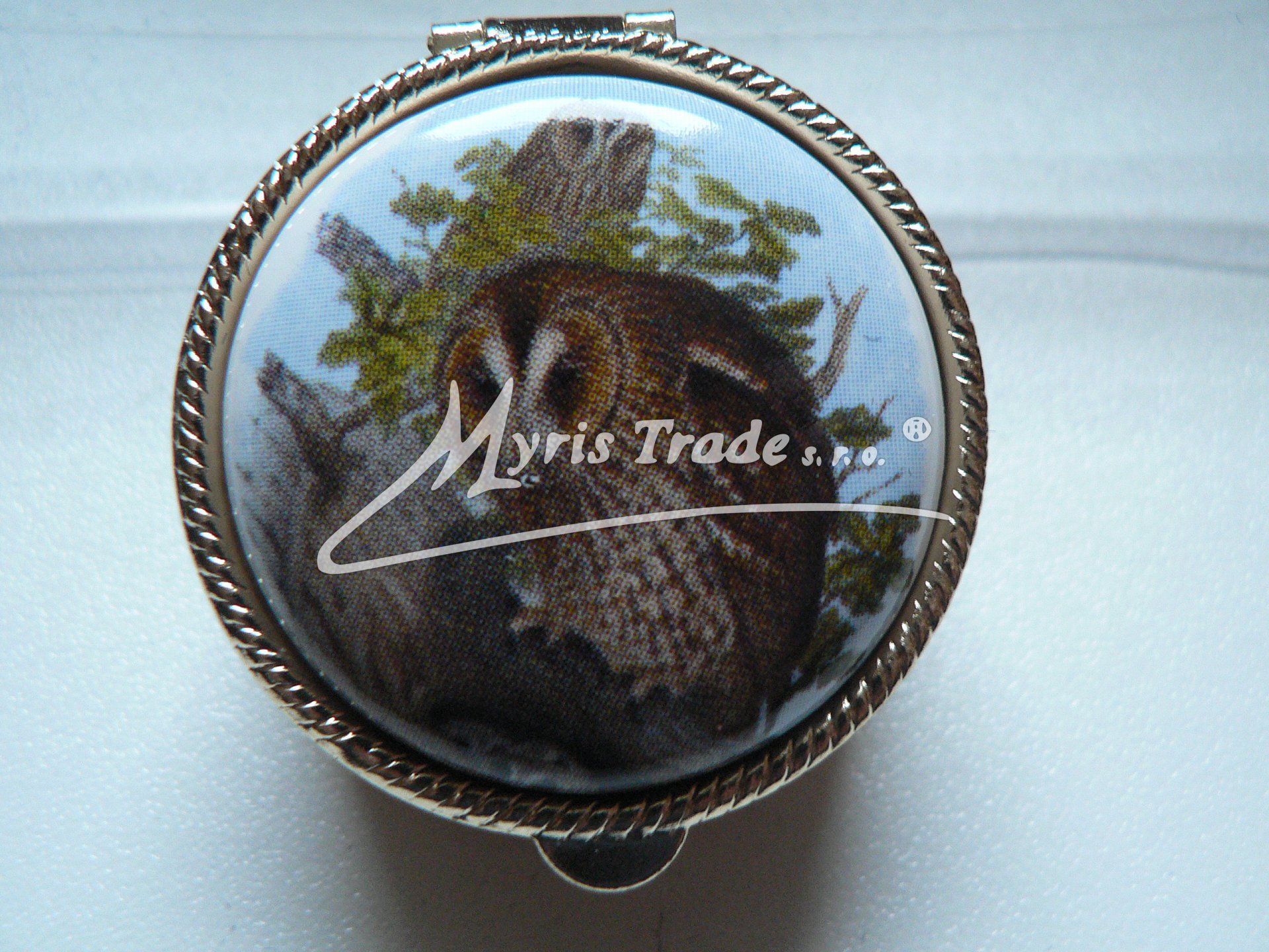 klasická kulatá lékovka je vyrobena z kovu zlaté barvy s porcelánovým víčkem s motivem sovy