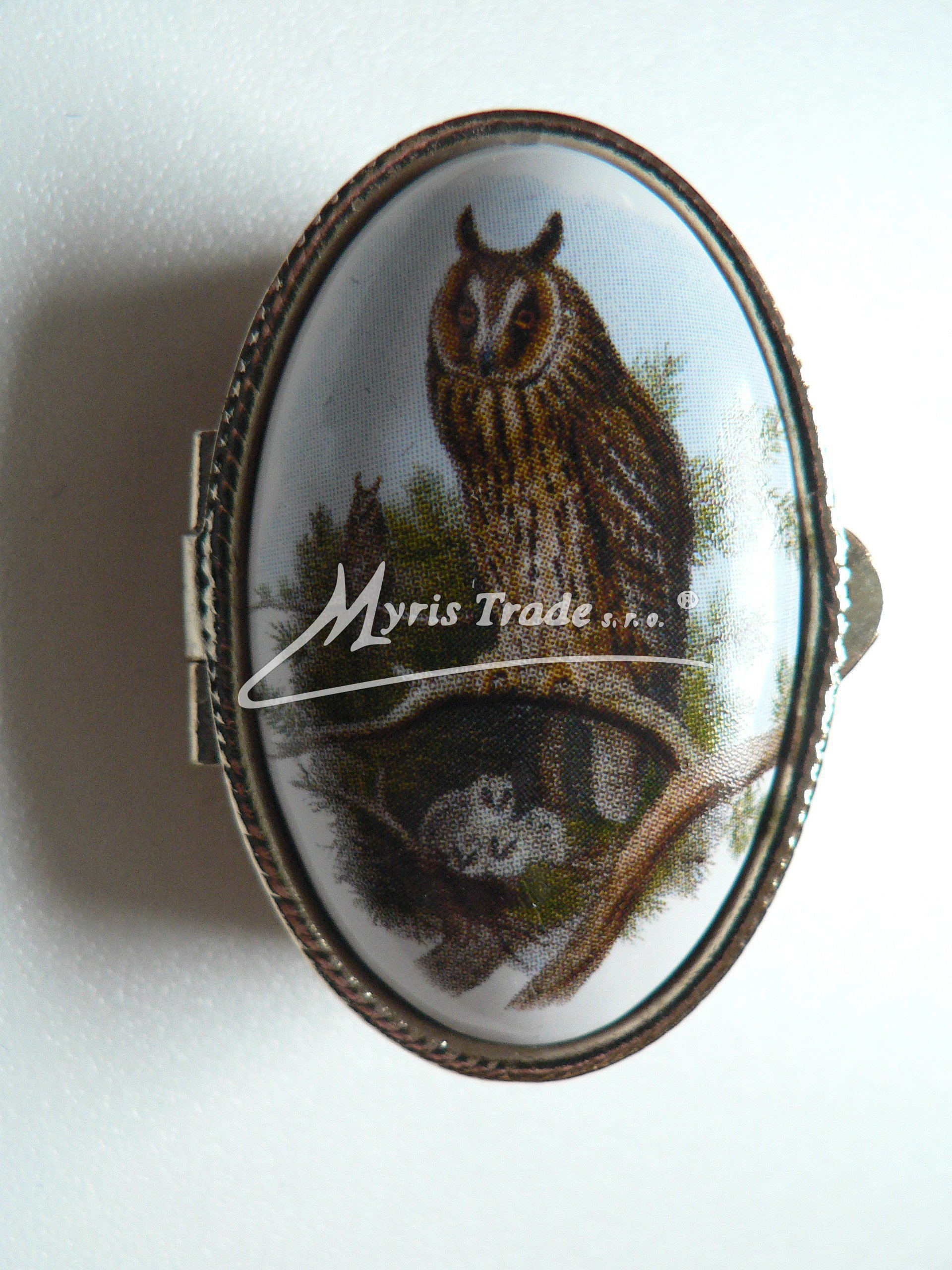 klasická oválná lékovka je vyrobena z kovu zlaté barvy s porcelánovým víčkem s motivem sovy