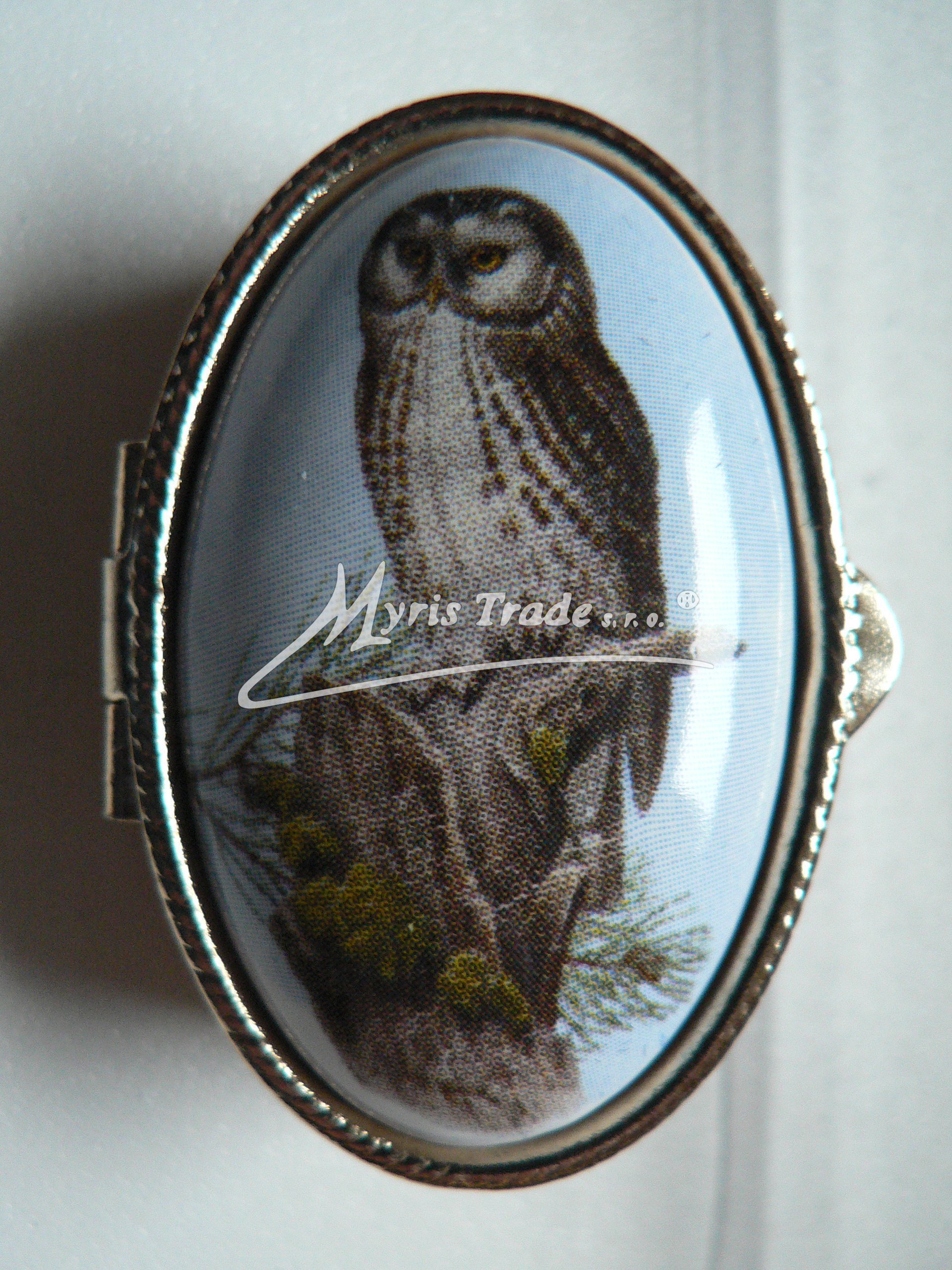 klasická oválná lékovka je vyrobena z kovu zlaté barvy s porcelánovým víčkem s motivem sovy