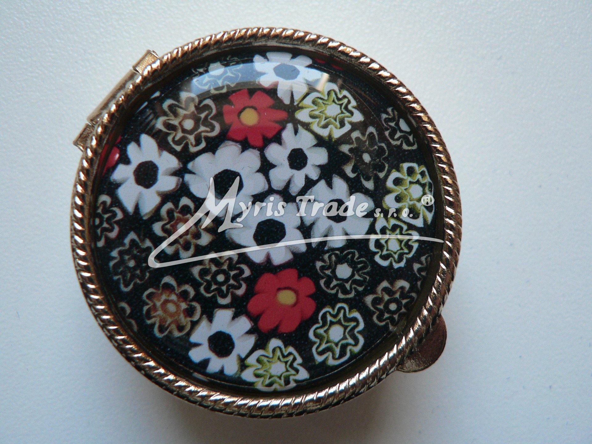 klasická kulatá lékovka je vyrobena z kovu zlaté barvy s porcelánovým víčkem s motivy, které vycházejí ze světoznámých tradičních vzorů výrobců muránského skla z Benátek.