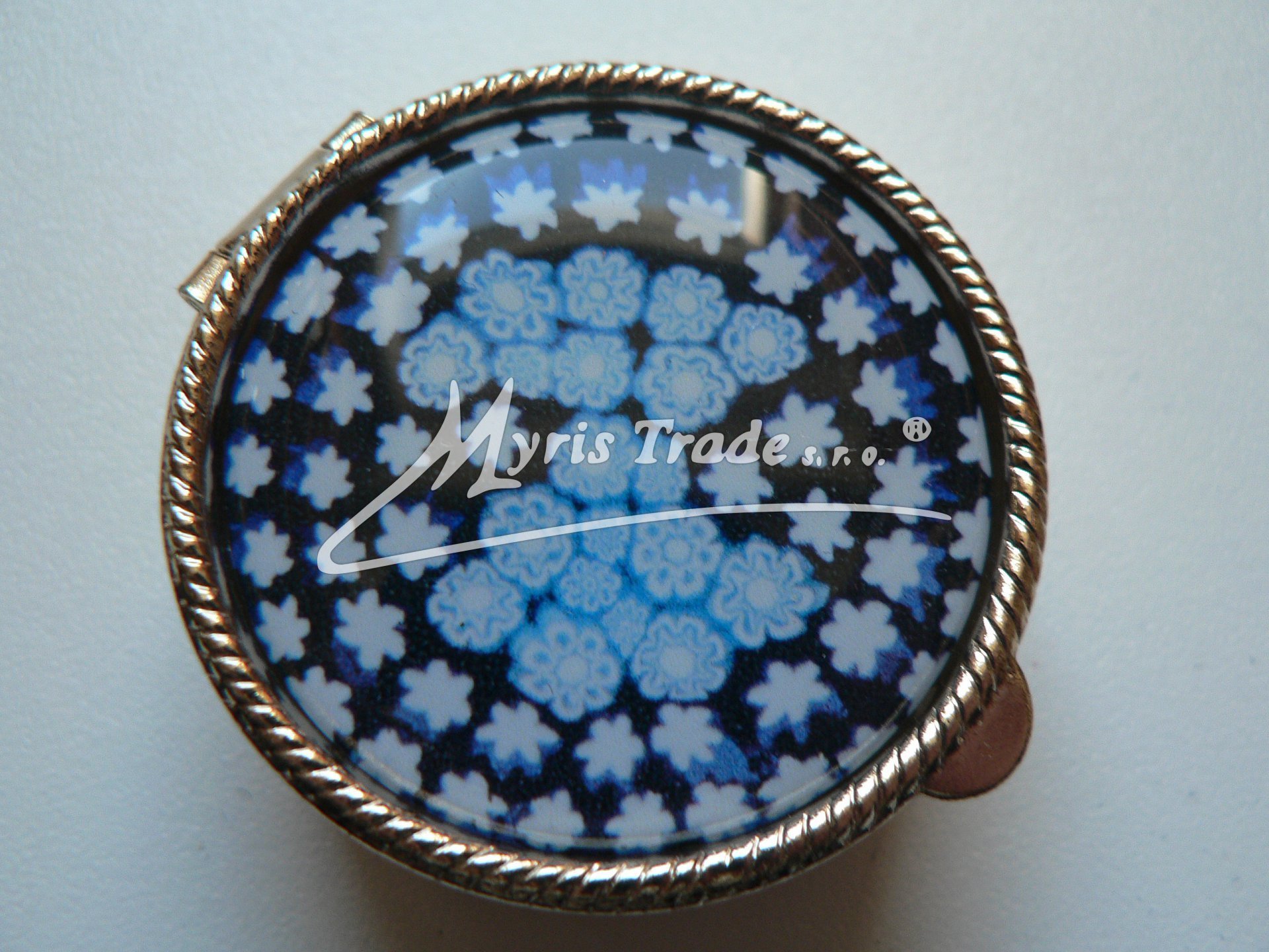 klasická kulatá lékovka je vyrobena z kovu zlaté barvy s porcelánovým víčkem s motivy, které vycházejí ze světoznámých tradičních vzorů výrobců muránského skla z Benátek.
