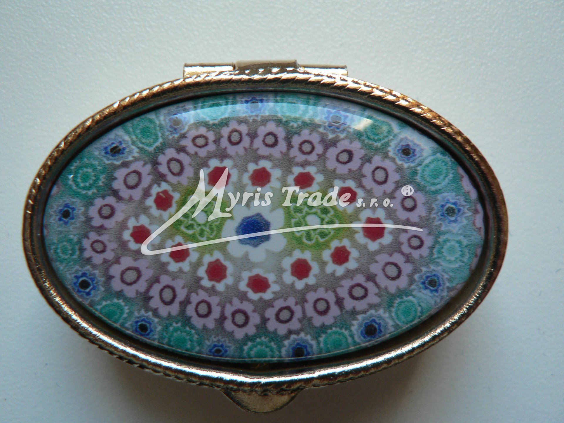 klasická oválná lékovka je vyrobena z kovu zlaté barvy s porcelánovým víčkem s motivy, které vycházejí ze světoznámých tradičních vzorů výrobců muránského skla z Benátek.