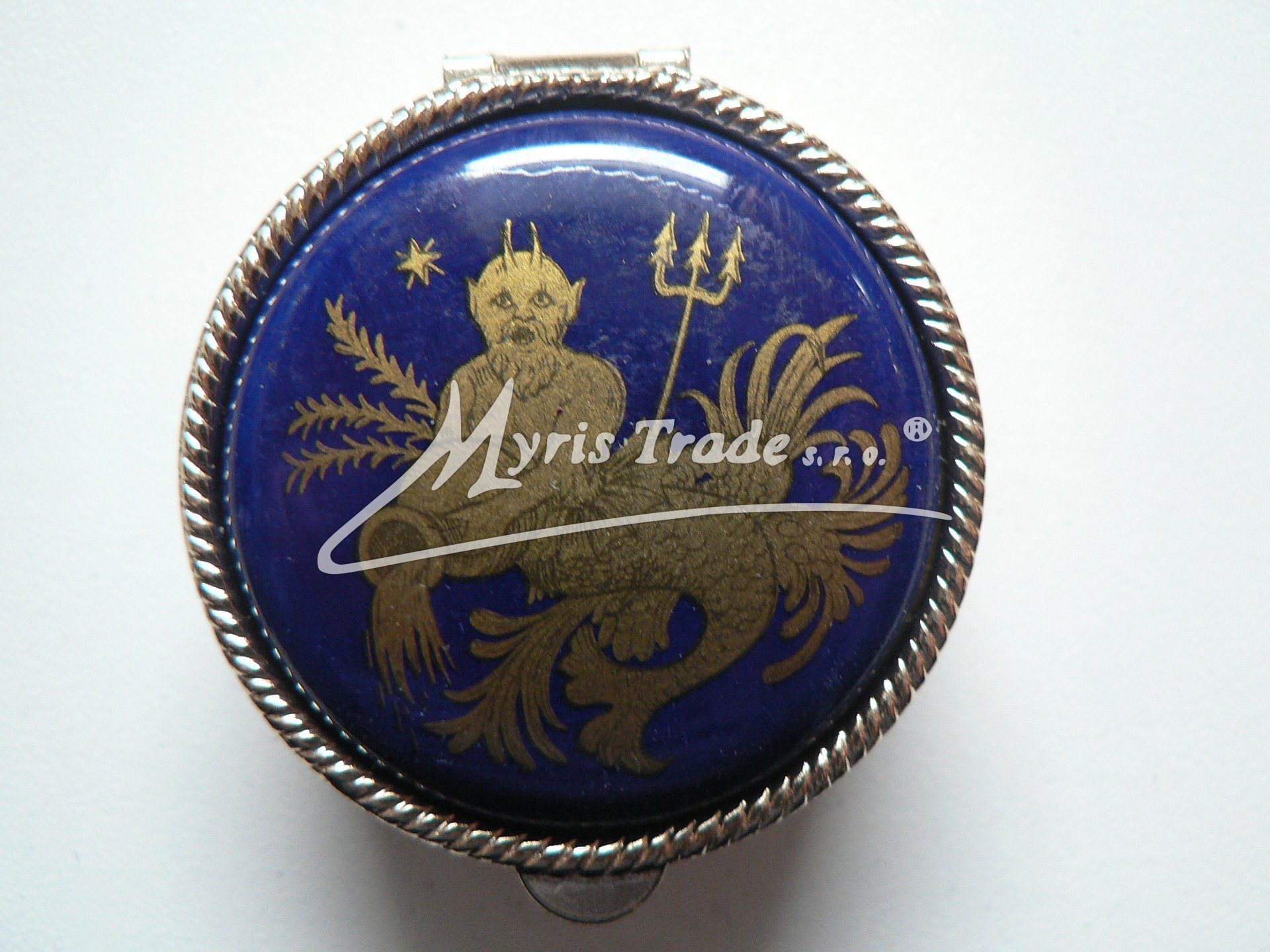 klasická kulatá lékovka je vyrobena z kovu zlaté barvy s porcelánovým víčkem s motivem ze zvěrokruhu