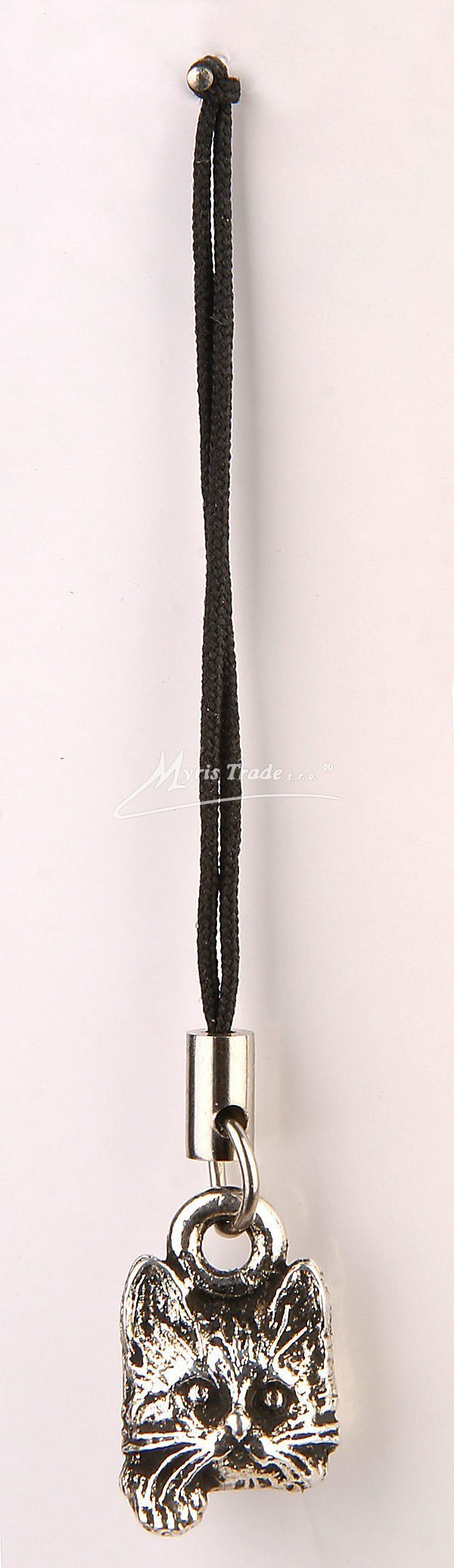 Přívěsek k mobilu ze stříbrného kovu s figurkou hlavy kočky. Přívěsky jsou baleny jednotlivě v idelitovém sáčku s možností zavěšení.