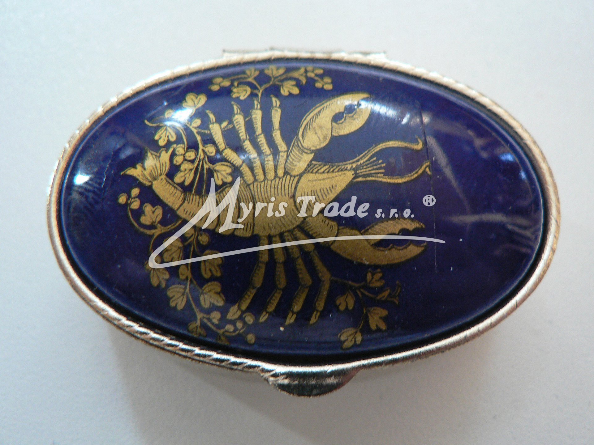 klasická oválná lékovka je vyrobena z kovu zlaté barvy s porcelánovým víčkem s motivem ze zvěrokruhu