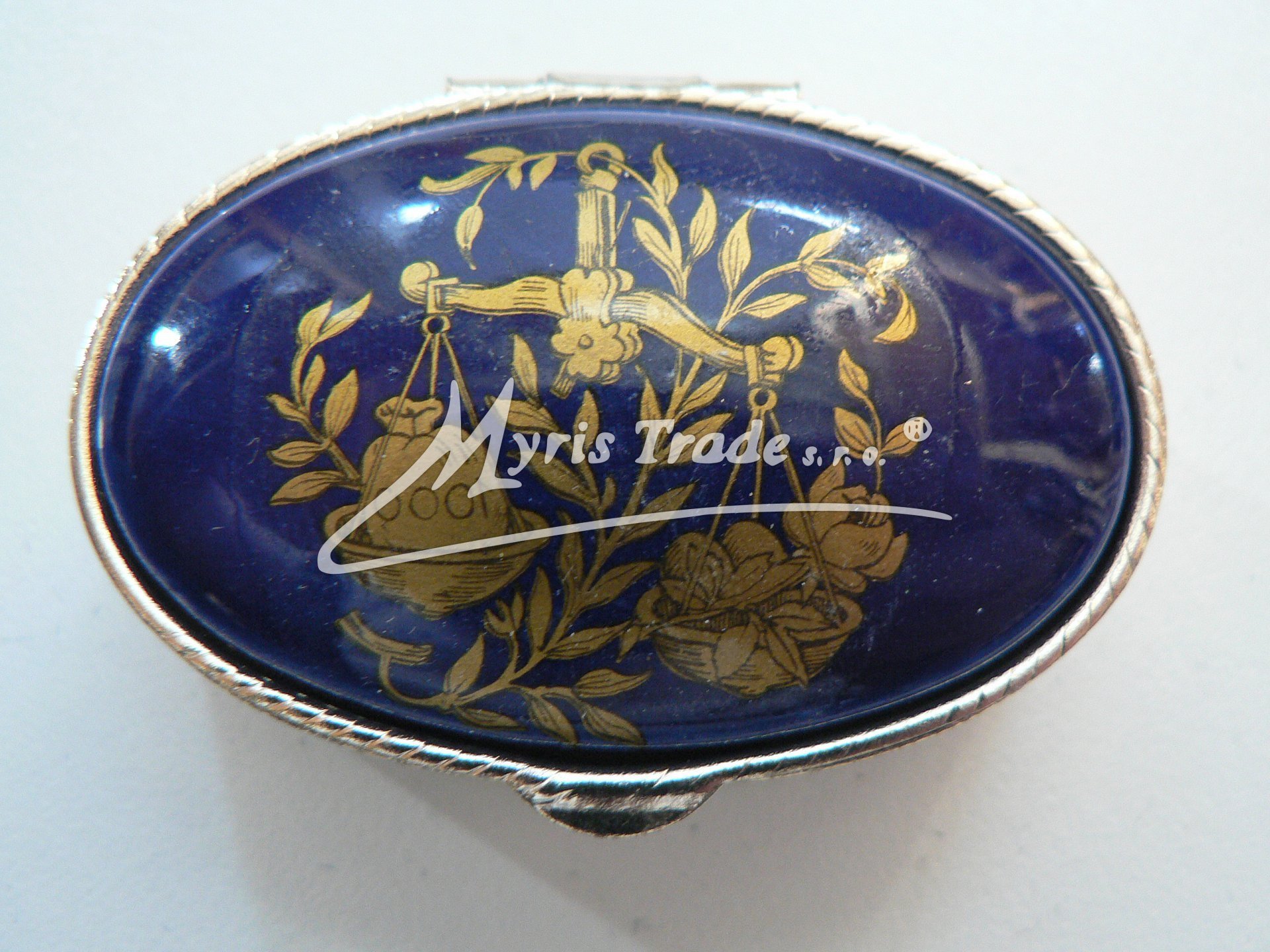 klasická oválná lékovka je vyrobena z kovu zlaté barvy s porcelánovým víčkem s motivem ze zvěrokruhu