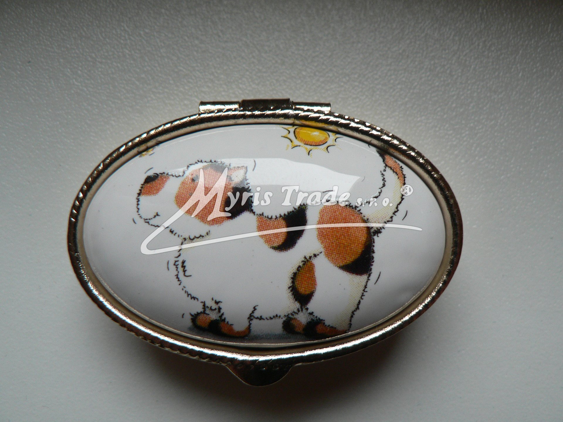 klasická oválná lékovka je vyrobena z kovu zlaté barvy s porcelánovým víčkem s motivem kreslených zvířátek