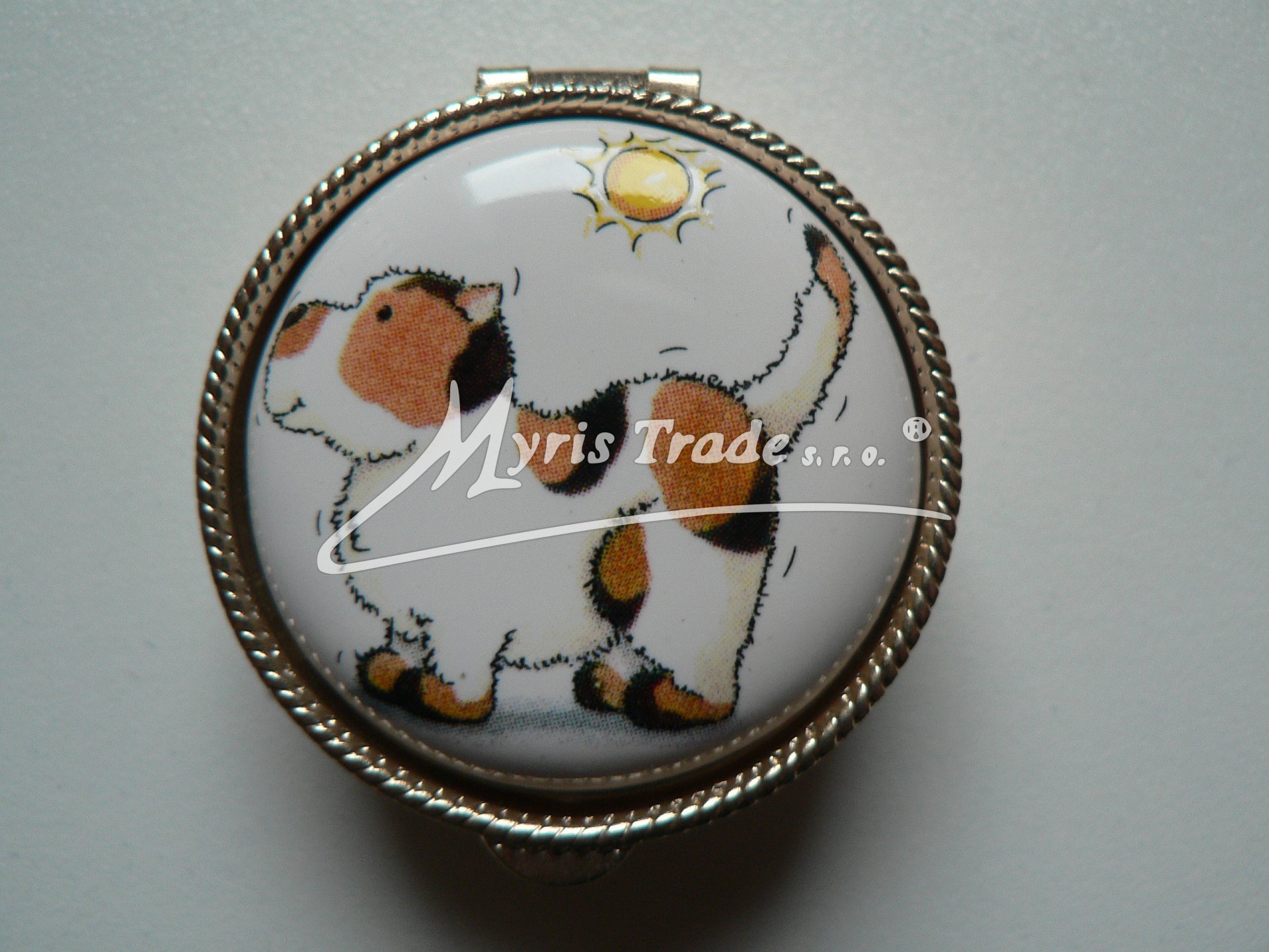 klasická kulatá lékovka je vyrobena z kovu zlaté barvy s porcelánovým víčkem s motivem kreslených zvířátek