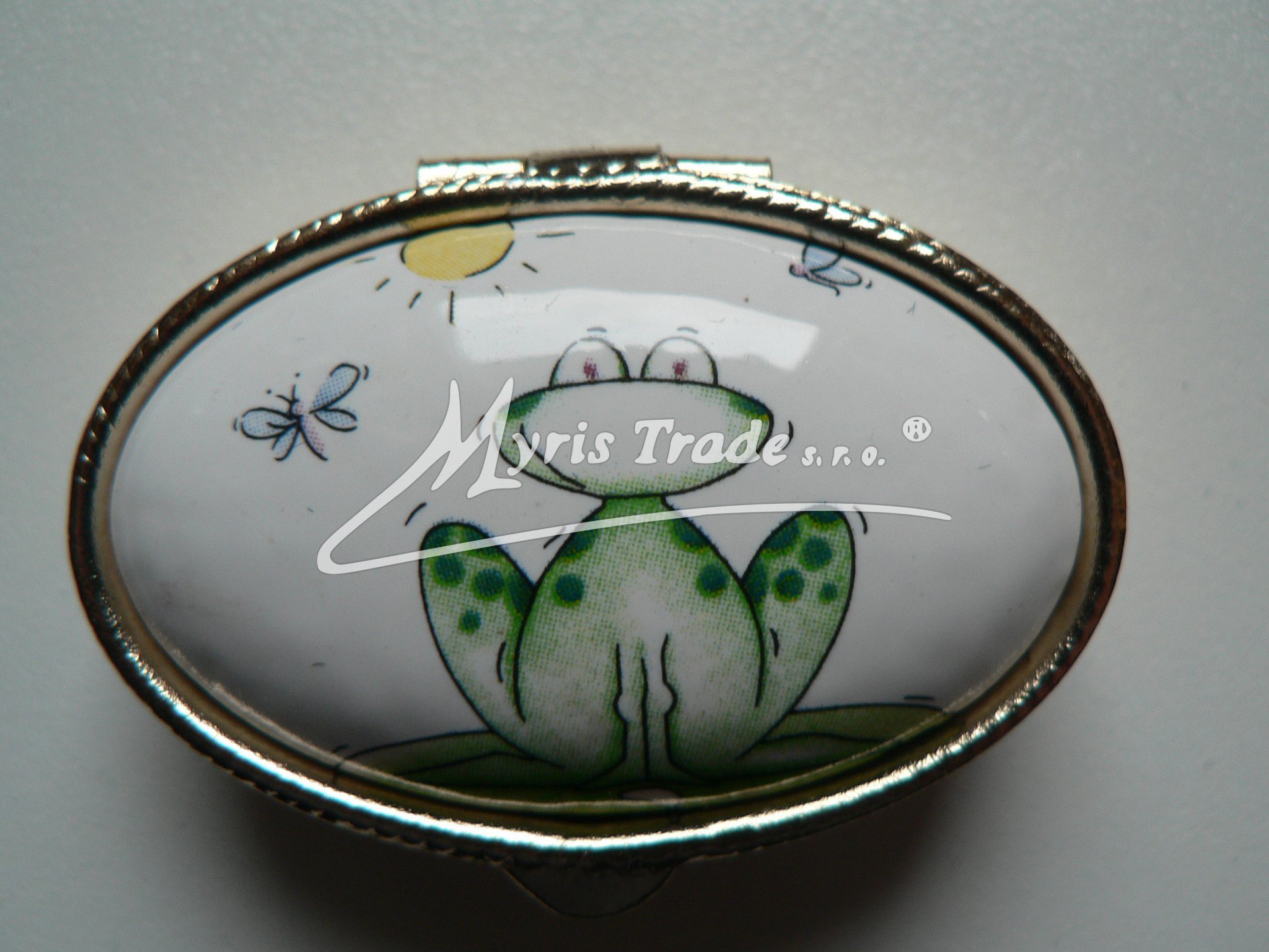 klasická oválná lékovka je vyrobena z kovu zlaté barvy s porcelánovým víčkem s motivem kreslených zvířátek