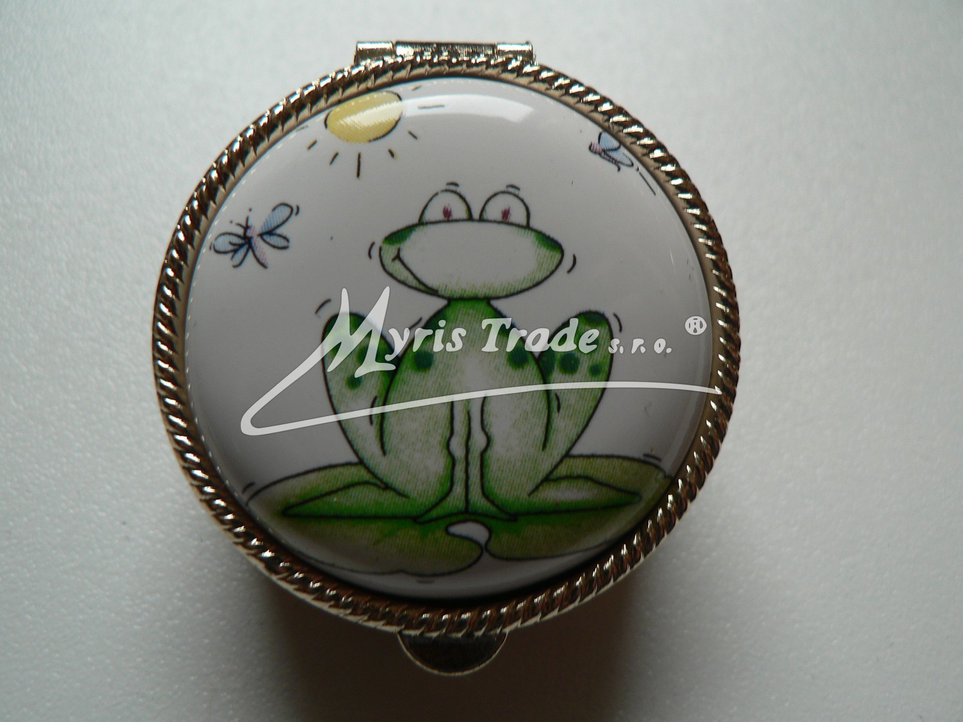 klasická kulatá lékovka je vyrobena z kovu zlaté barvy s porcelánovým víčkem s motivem kreslených zvířátek