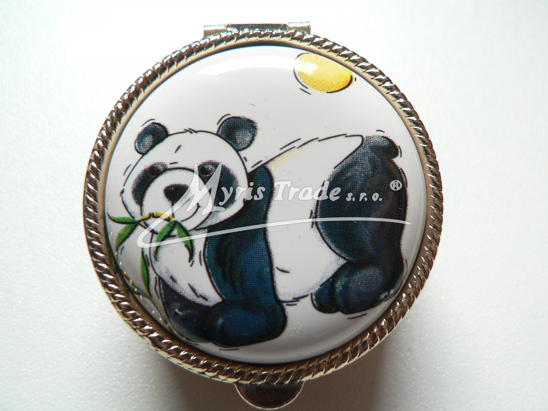 klasická kulatá lékovka je vyrobena z kovu zlaté barvy s porcelánovým víčkem s motivem kreslených zvířátek