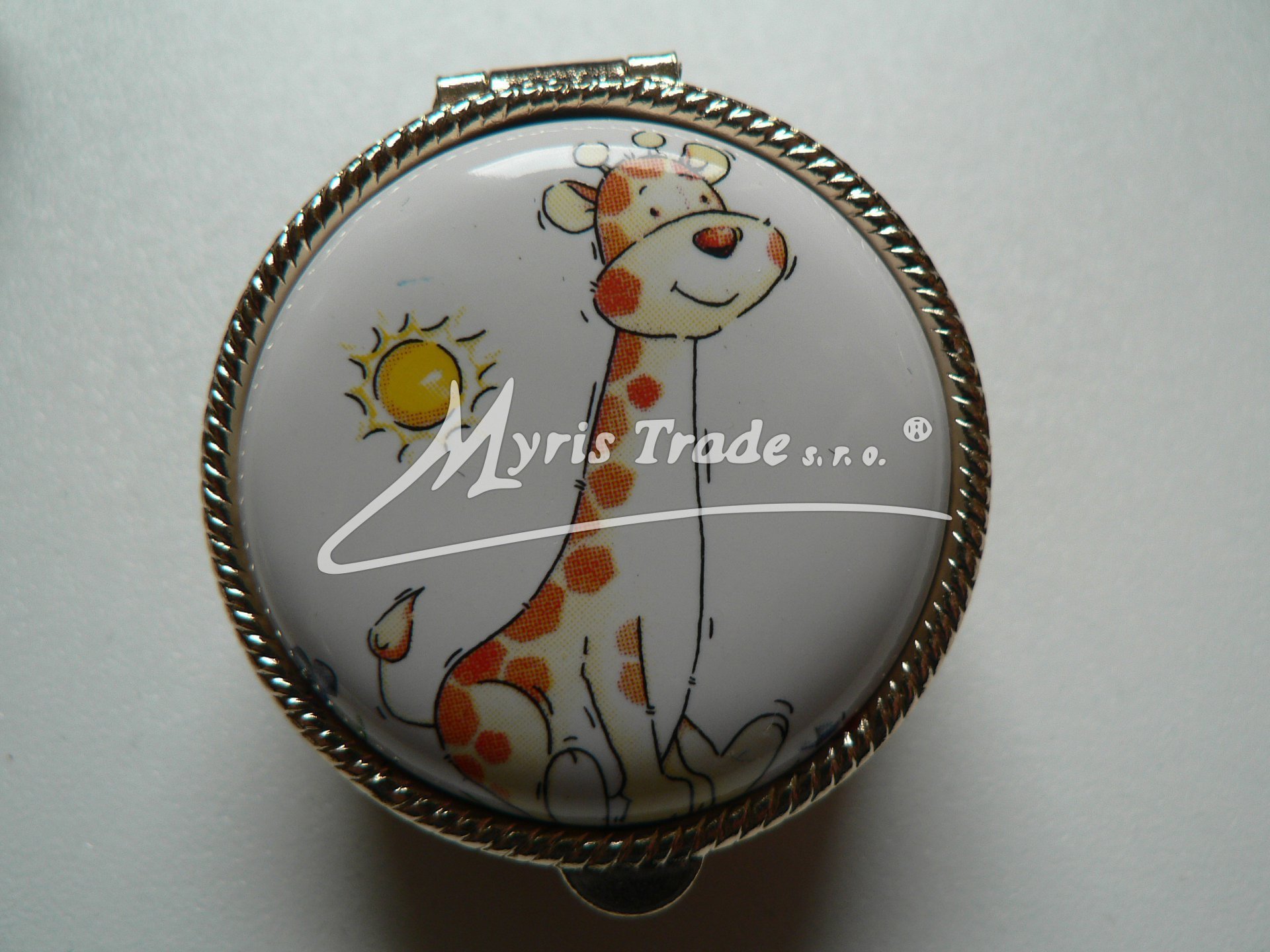 klasická kulatá lékovka je vyrobena z kovu zlaté barvy s porcelánovým víčkem s motivem kreslených zvířátek
