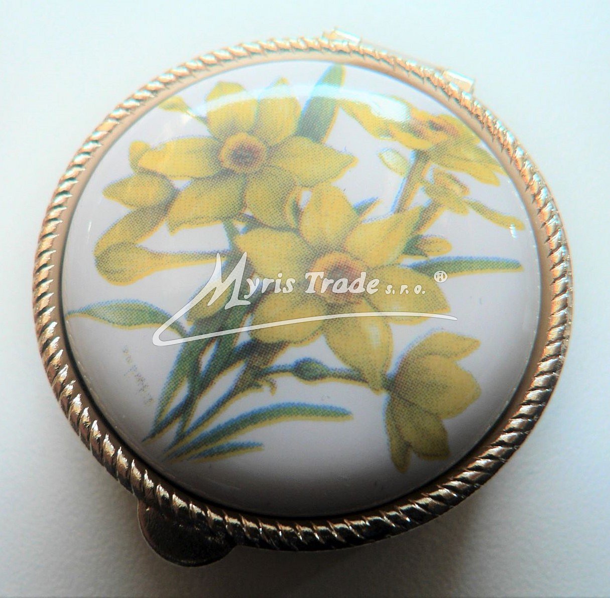 klasická kulatá lékovka je vyrobena z kovu zlaté barvy s porcelánovým víčkem s květinovým motivem