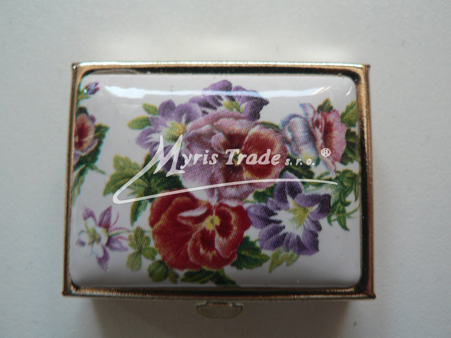 klasická obdélníková lékovka je vyrobena z kovu zlaté barvy s porcelánovým víčkem s květinovým motivem