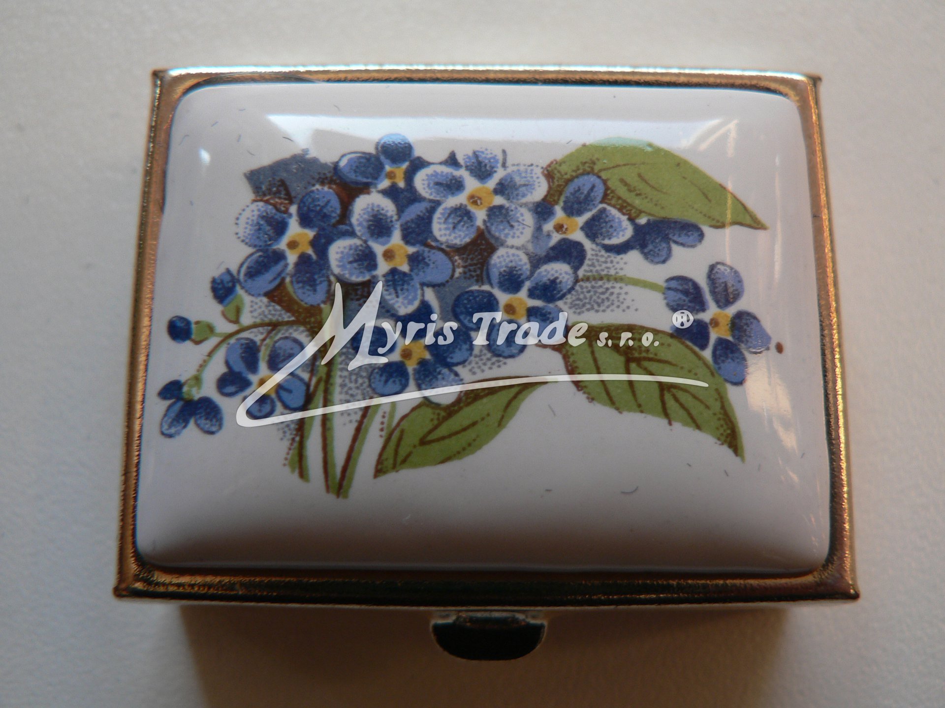 klasická obdélníková lékovka je vyrobena z kovu zlaté barvy s porcelánovým víčkem s květinovým motivem